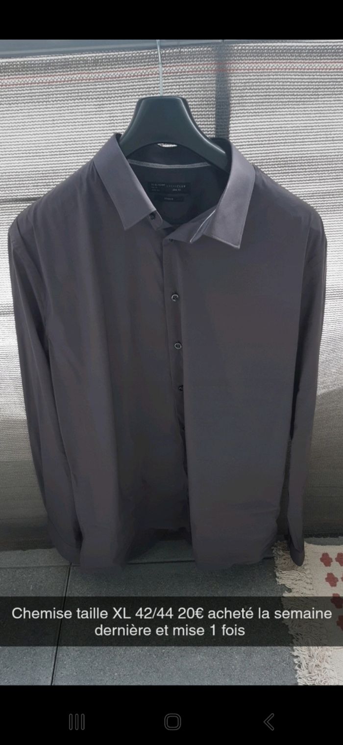 Bonjour ✴️Essentielle du vestiaire masculin, cette chemise est un must-have. Coupe slim, col français et popeline stretch, c'est la chemise idéale à porter et pour toutes les occasions, elle s'adapte parfaitement à vos looks en apportant une touche d'élégance. ✴️Portée 1 fois à un mariage ✴️Petit accro recousu proprement voir photo suite à une chute dû à une chaise cassée ✴️Gris anthracite ✴️66% coton, 29% polyamide, 5%élasthane