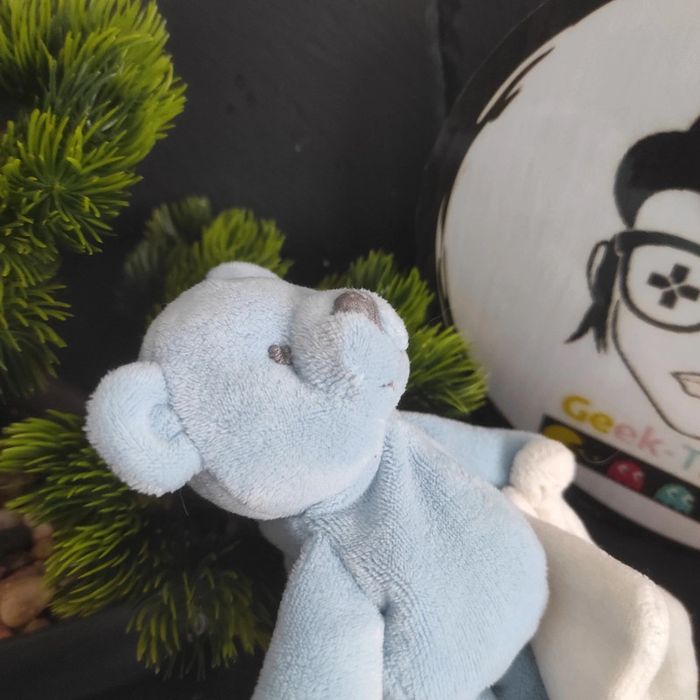 Doudou ours bleu mouchoir blanc Jacadi Paris Gris #geektradedoudou