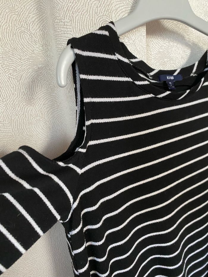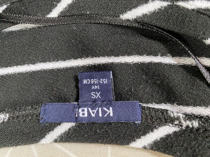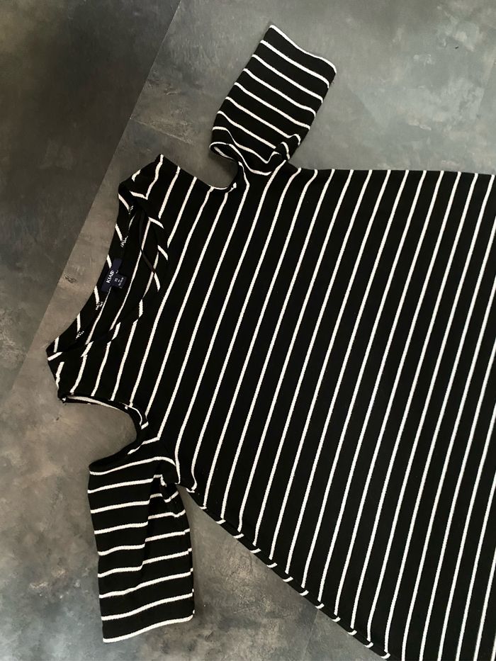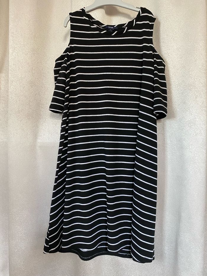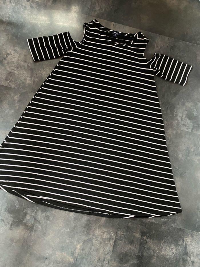 Robe manches courtes, épaules découvertes, noire fines rayures blanches horizontales Taille XS ou 12/14 ans 152-156 cm kiabi Bon état car fines bouloches