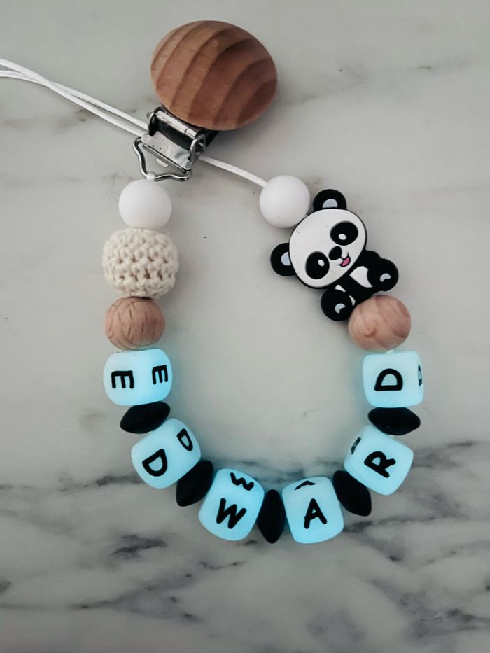 Attache tétine personnalisé en silicone ou en bois au souhait de l’acheteur . Personnalisable au choix de l’acheteur que ce soit la couleur comme le prénom ou le thème . Le fil est doublé pour plus de sécurité tout le long de l’attache tétine. N’hésitez pas à me demander et regarder mon dressing. Une photo vous sera envoyée avant l’expédition pour vous ayez un aperçu du rendu. Tous les produits sont réalisés avec du materiel spécial conçu aux bébés , enfants.