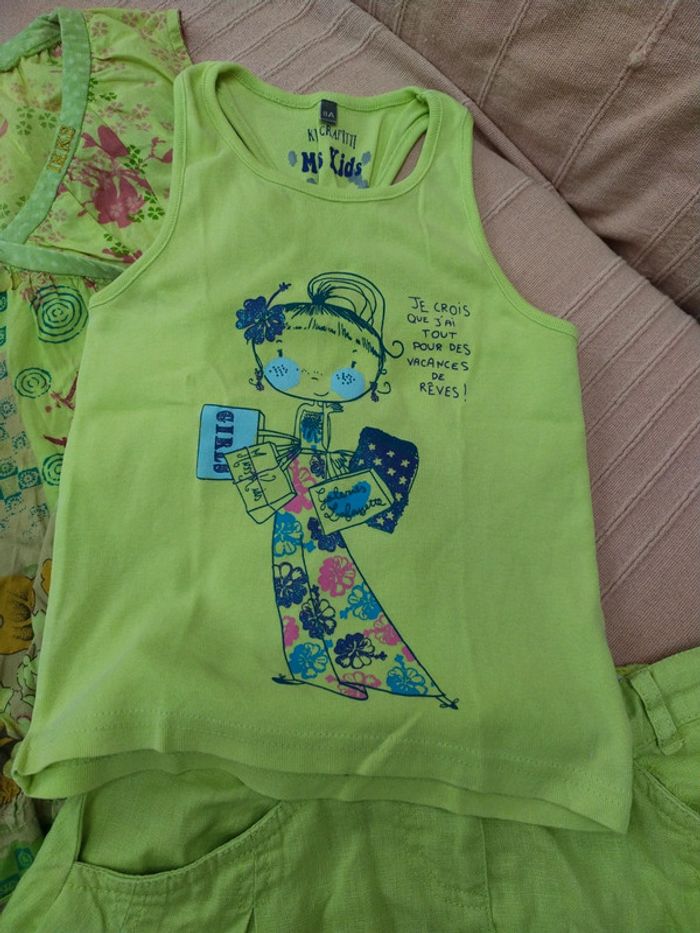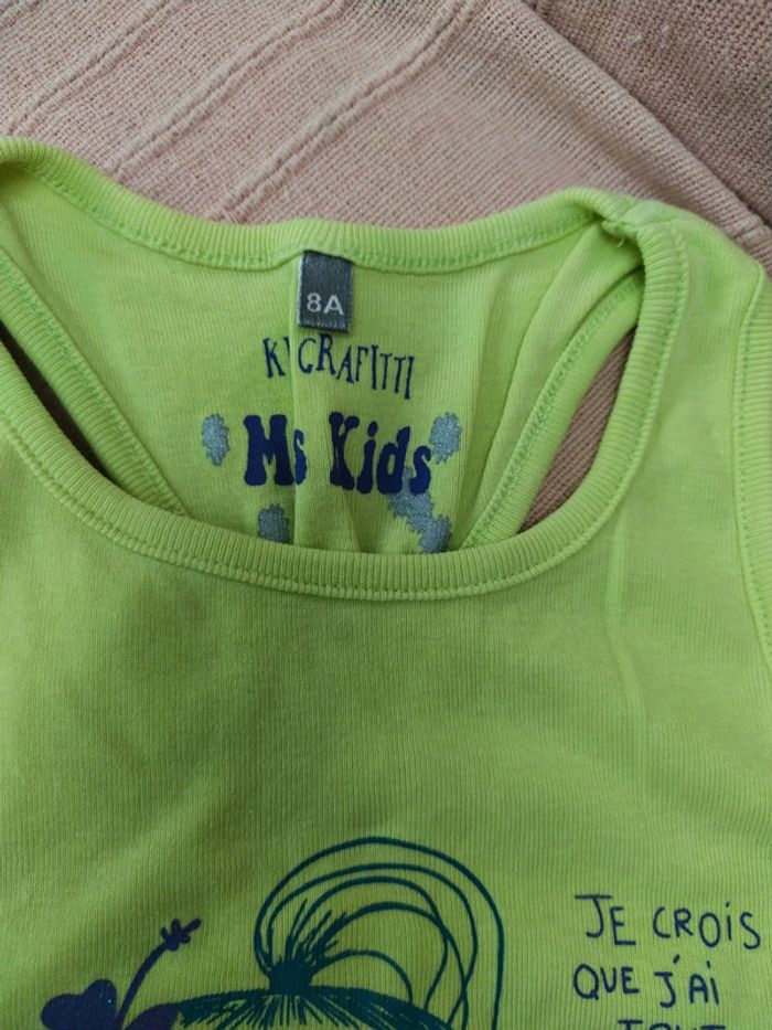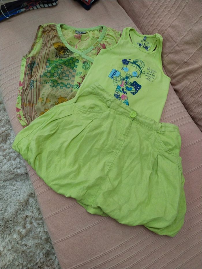 Une jupe boule Okaïdi, un débardeur kids graffiti, une blouse légère IKKS La jupe comporte une minuscule tâche, voir photo Les hauts sont en parfait état