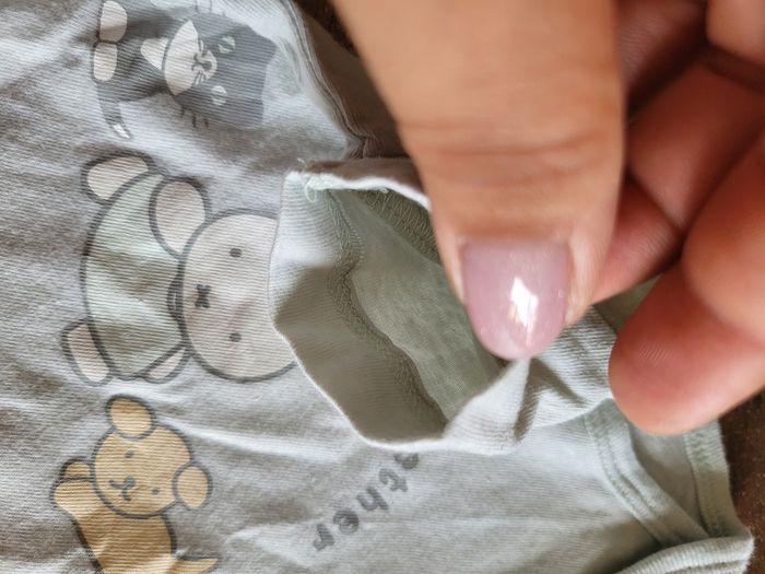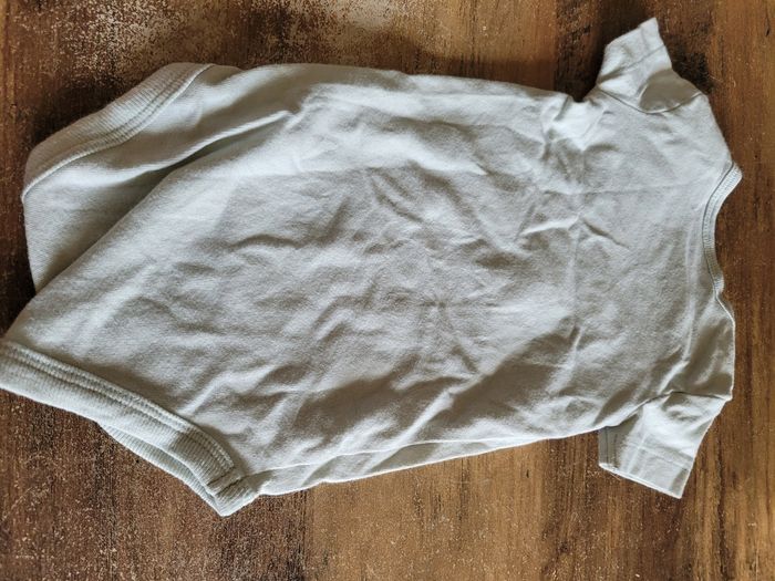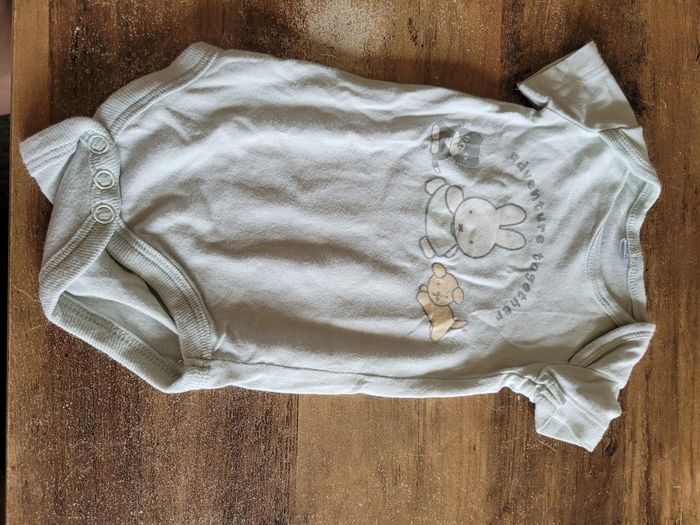 Petit bodie Manche court Couleur vert d'eau Dessin lapin chat et chien Taille 3 mois Mi saison Attaché en bas Étiquette coupé