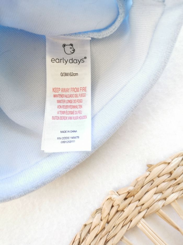 👶 Bonnet bleu clair 👶 Early Days 🖊️ ÉTAT ✅️: Parfait👌 - Jamais porté 🆕 🖊️ DESCRIPTION 🙂: ▪️Taille 0/3 Mois - 62 cm ▪️Matière: 76% coton - 24% polyester ▪️Tissu velours tout doux ▪️Base à revers cousu 🪡 ▪️Couleur: Bleu 🔵 ciel 💜