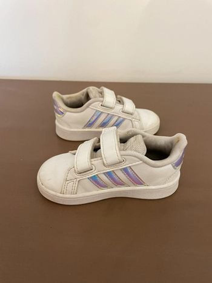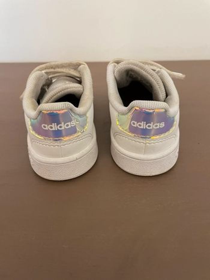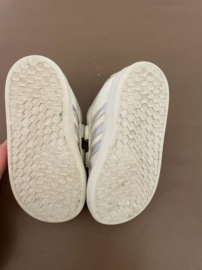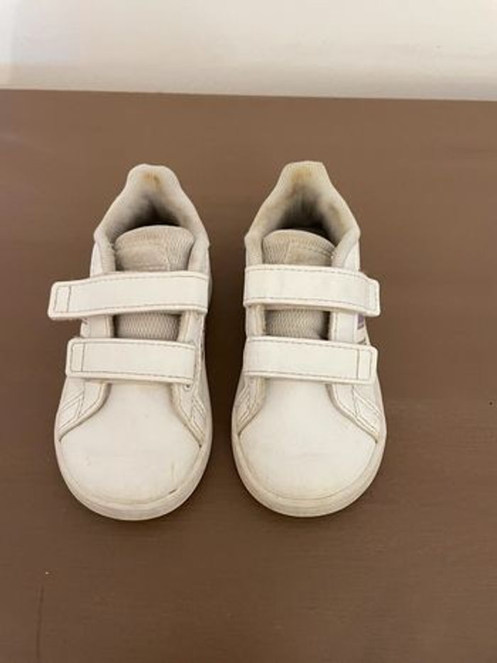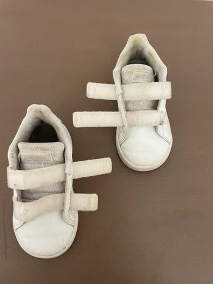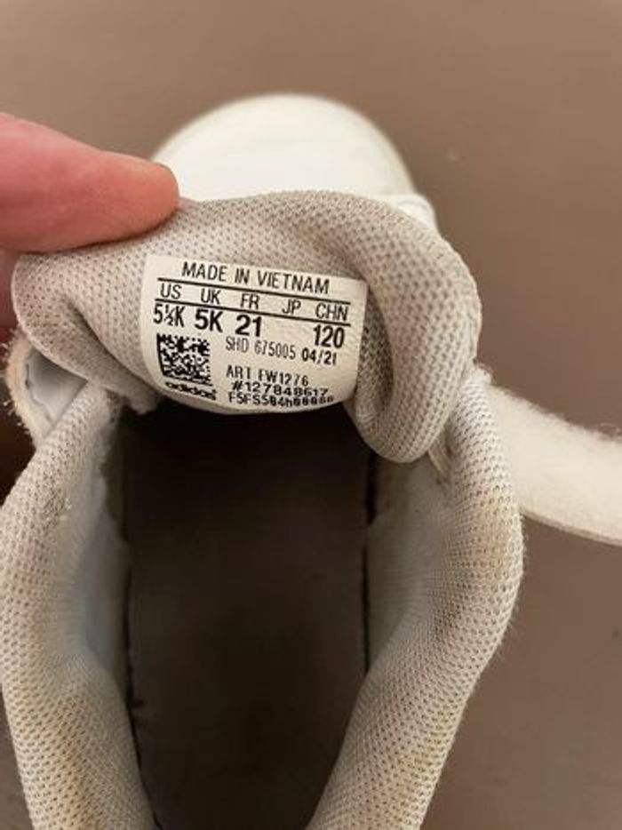 Basket Adidas. Le tissus blanc n’est plus net et il y a des tâches (voir photos). Pointure : 21 Marque : Adidas #chaussures21lulvque