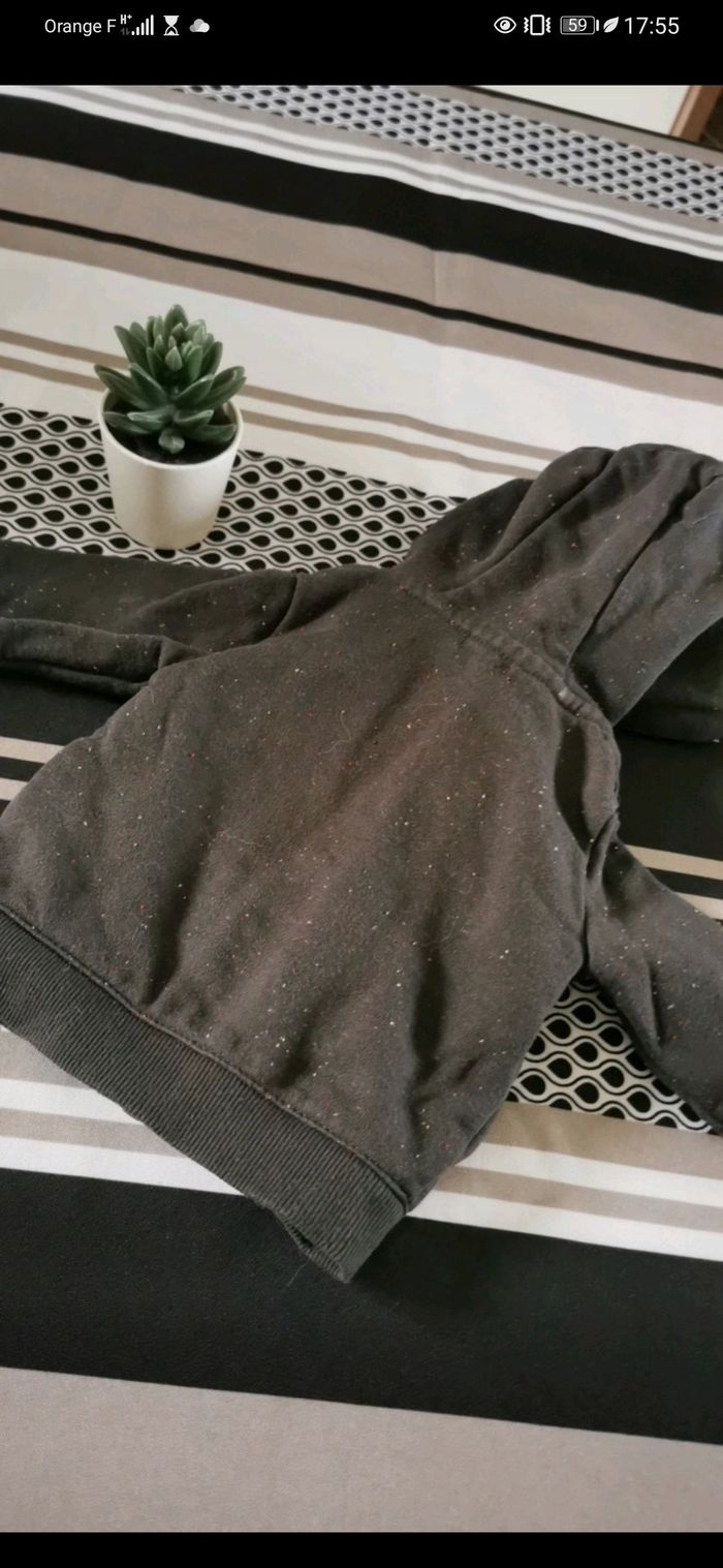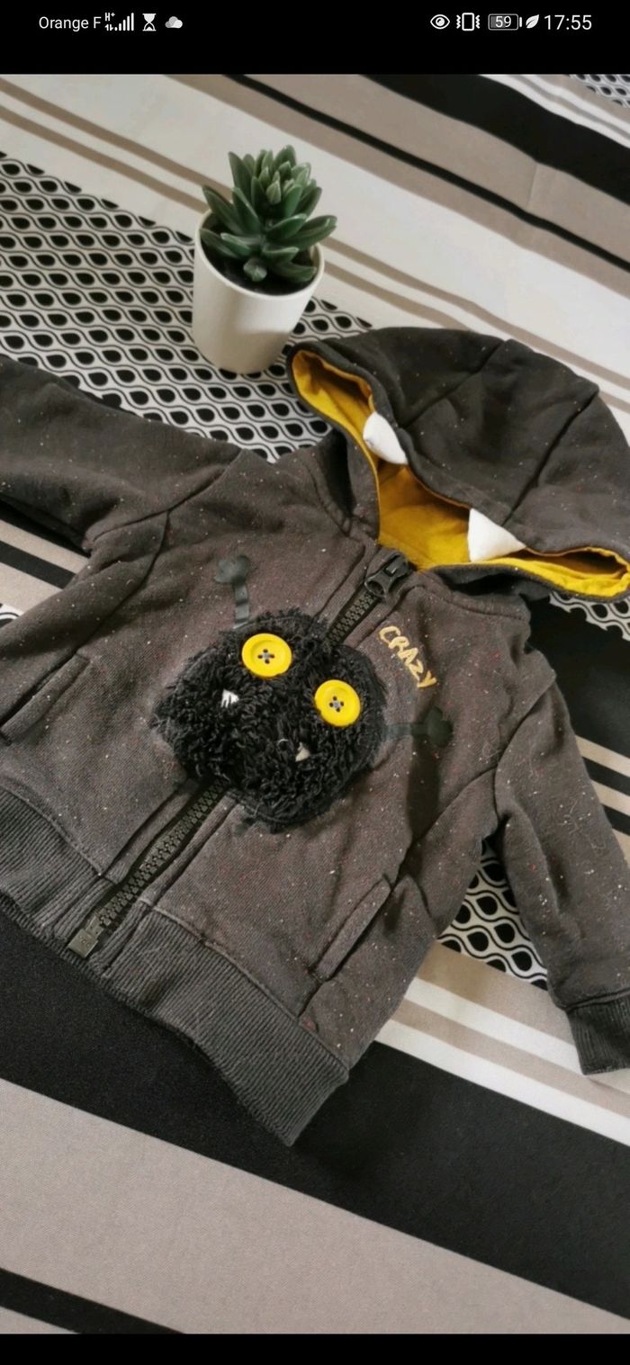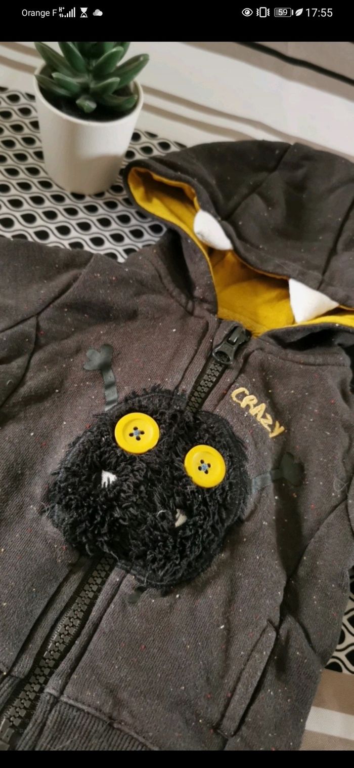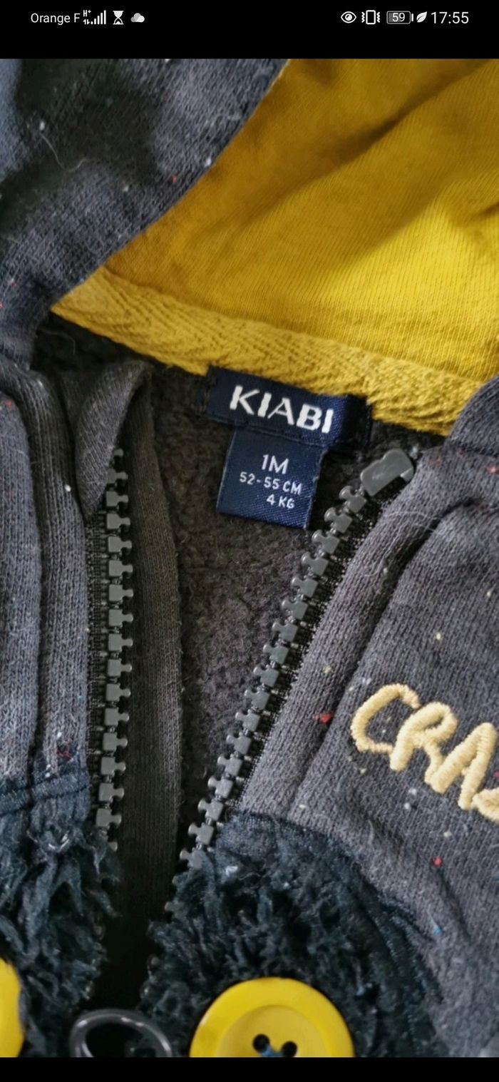 Sweat à zip avec capuche et motif Marque : Kiabi Taille : 1 mois Couleur : gris et jaune Tres bon état