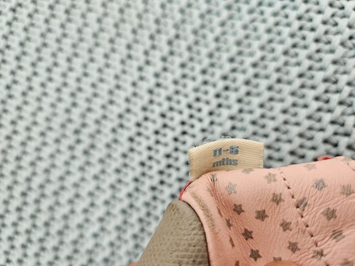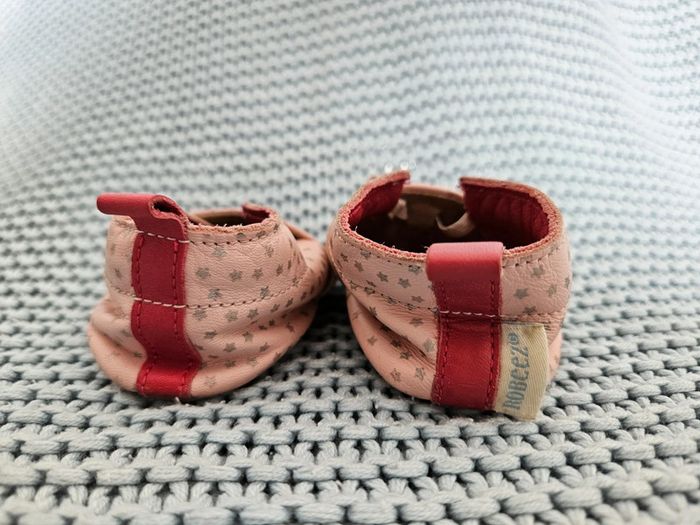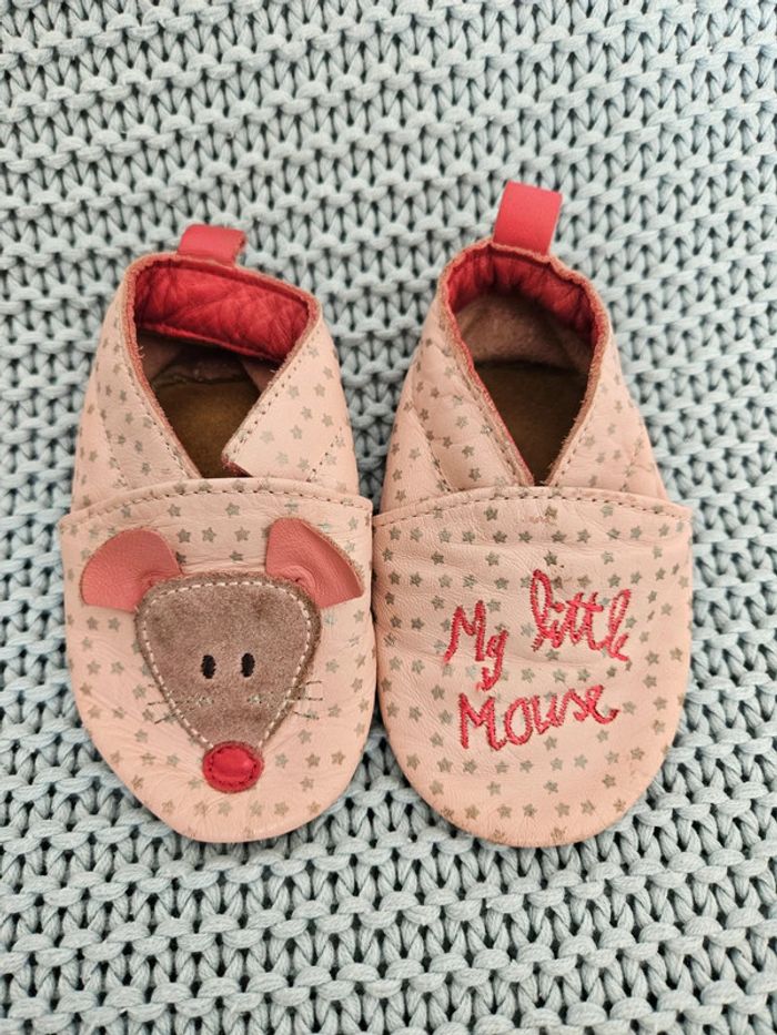 Chaussons roses à étoiles grises décor souris " My Little mouse" Élastique détendu. Marque Robeez. Taille 0-6 mois. Longueur de semelle : 11 cm. #mimidacenfant #mimidacchaussures #mimidacchaussons