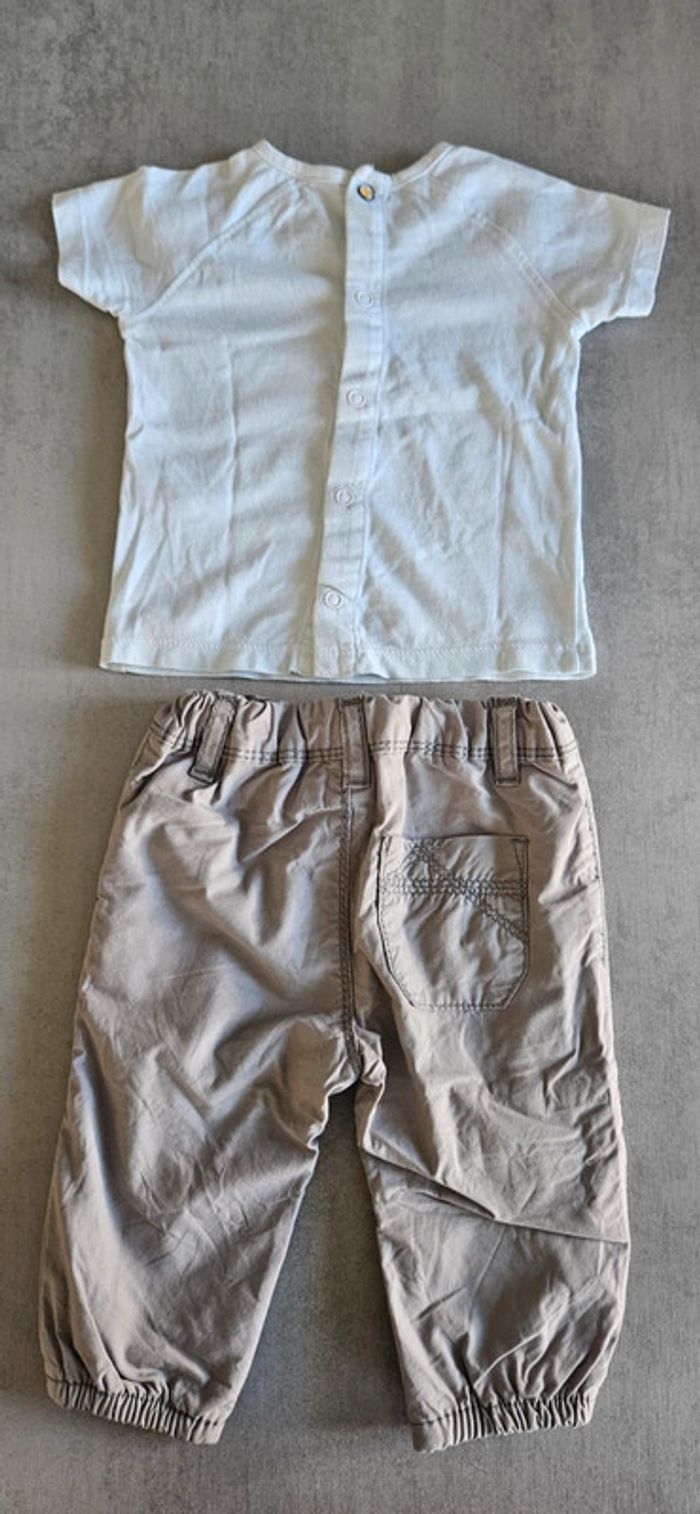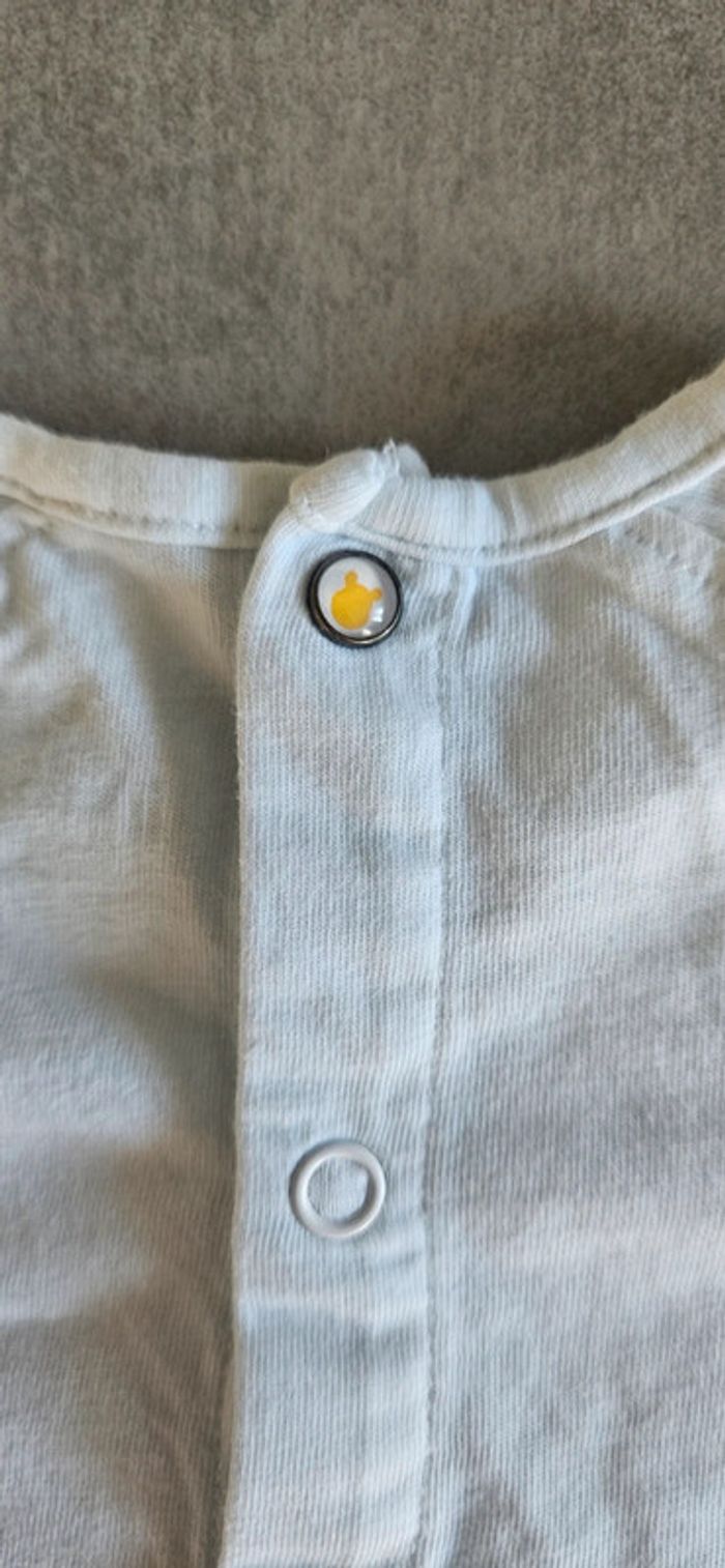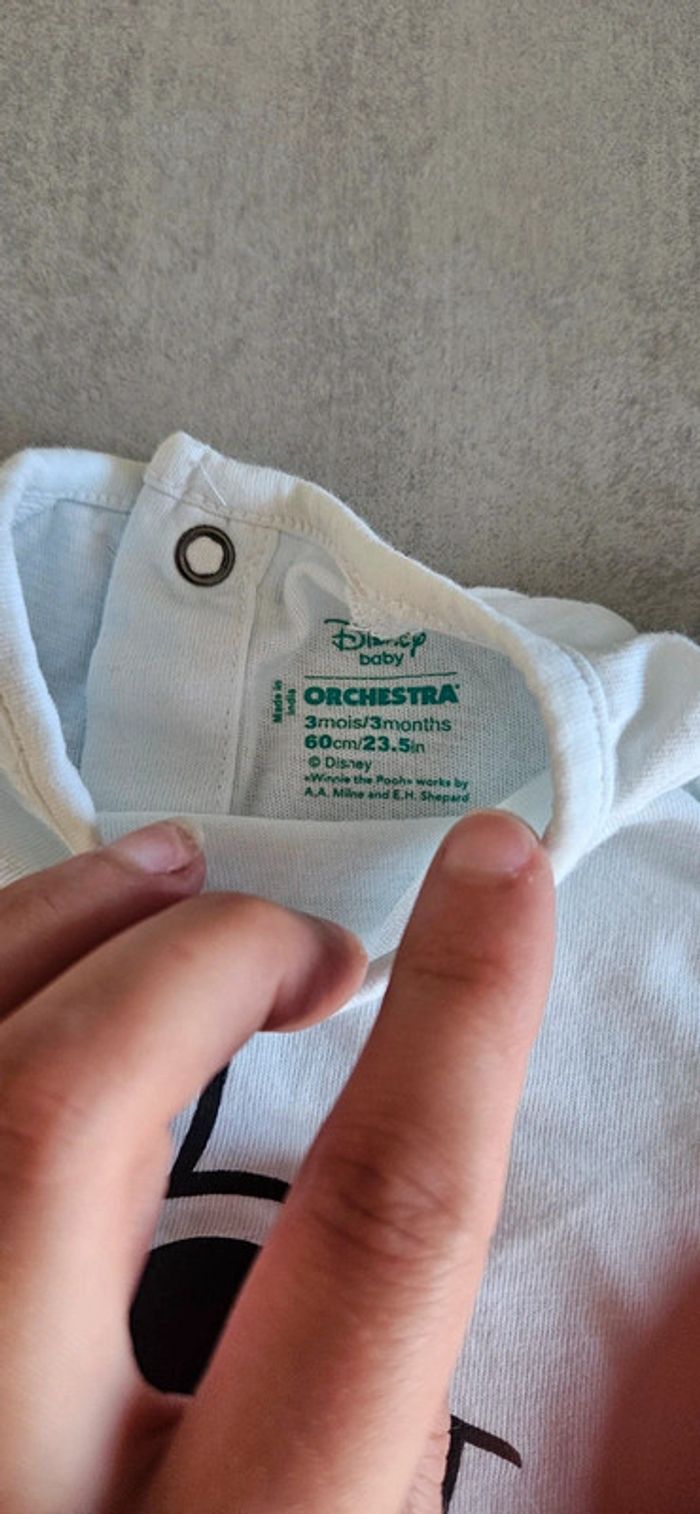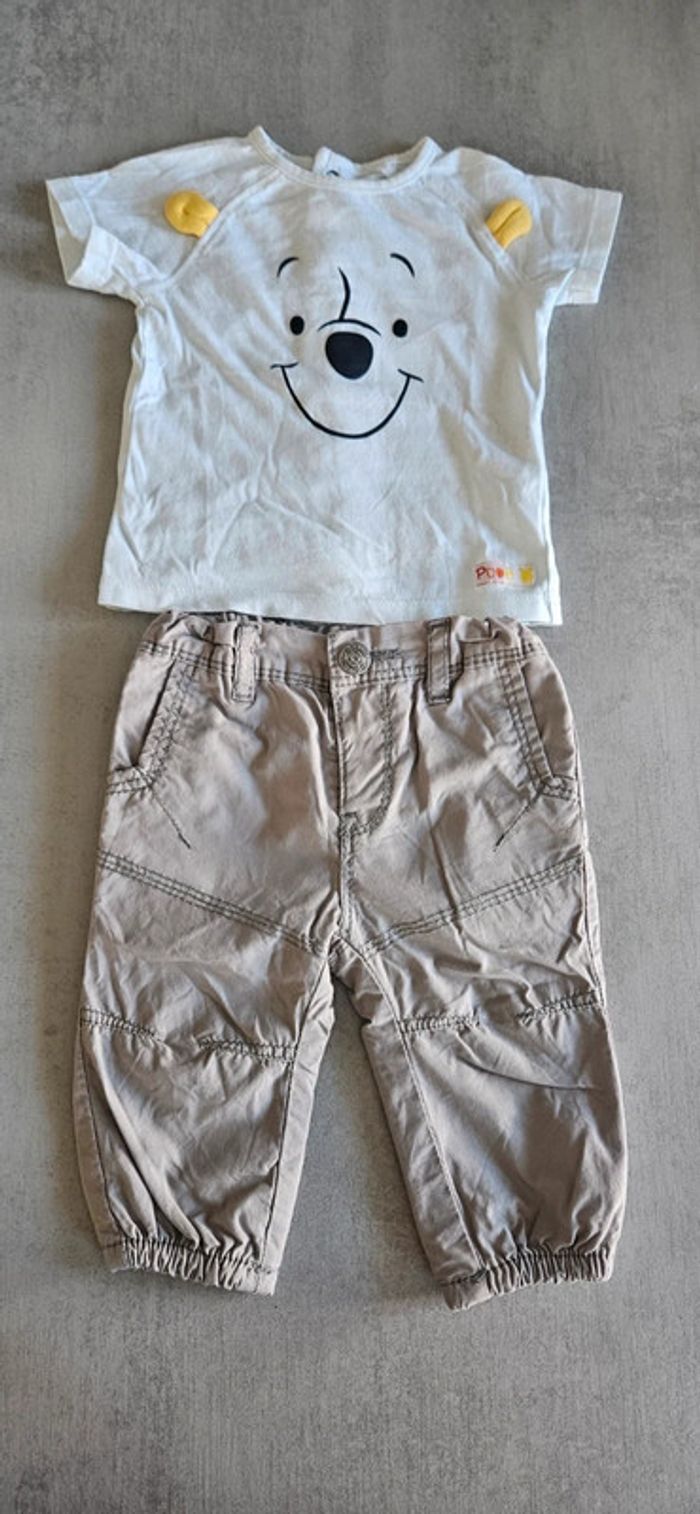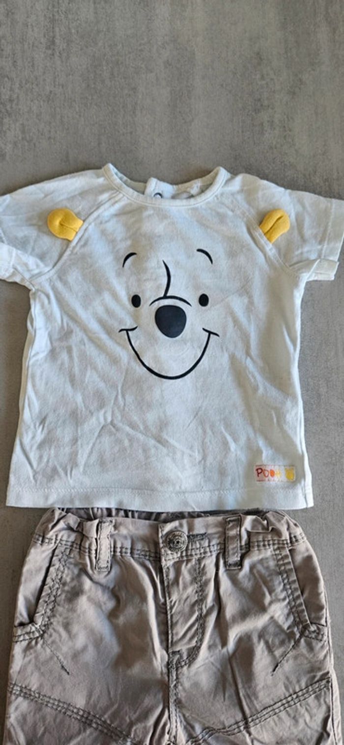 Ensemble t-shirt manches courtes winnie the pooh (winnie l'ourson) avec oreilles relief jaunes. Ouverture pratique le long du dos. + pantalon. Le tout taille 3 mois et très bon état