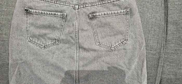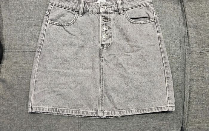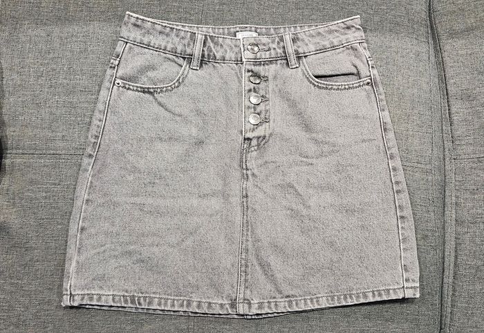 Jupe en jean gris clair. 2 poches avant, 2 poches arriere. Fermeture a boutons. Marque pimkie taille 34 Très bon état, ni tache ni accroc