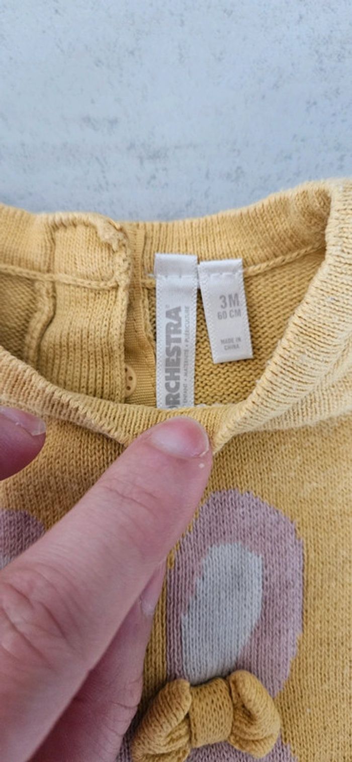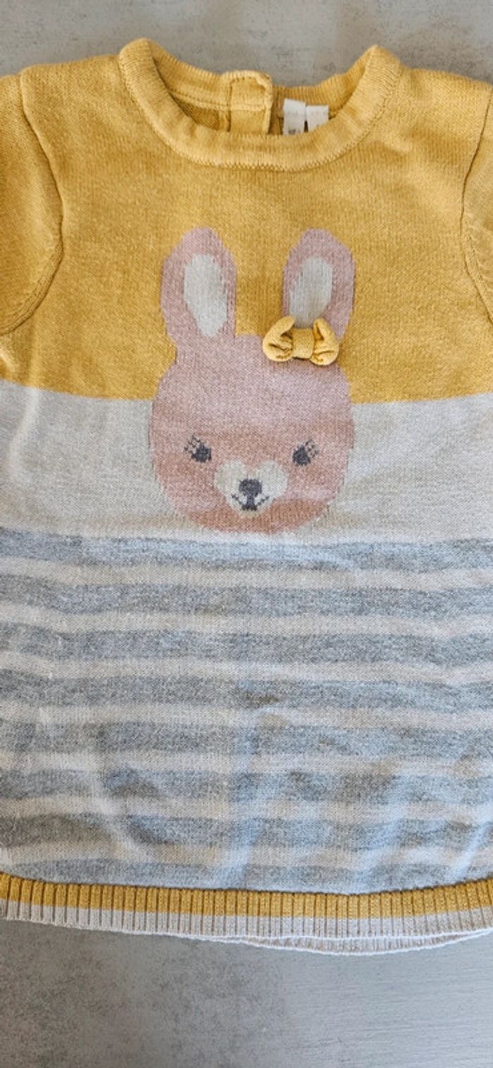 Robe manches longue chaude motif lapin avec noeud 3D. Jaune et blanche rayé gris. Pressions en haut du dos Marque orchestra taille 3 mois Ni tache ni accroc A1