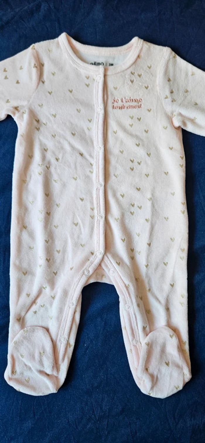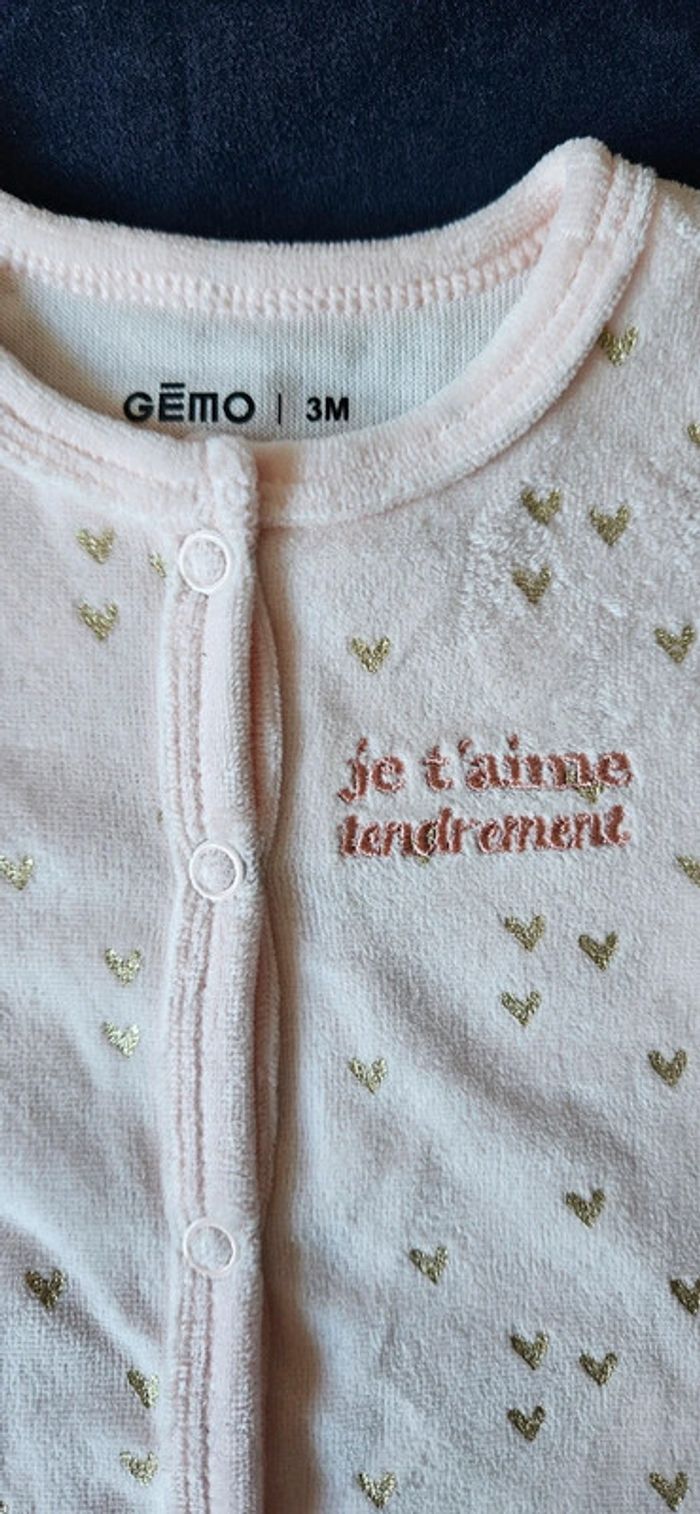 Grenouillere rose pale avec coeurs dorés, a paillettes Neuve, ouverture pratique par pressions devant et à l'entrejambe. "Je t'aime tendrement" Étiquette antivol Marque gemo taille 3 mois A1