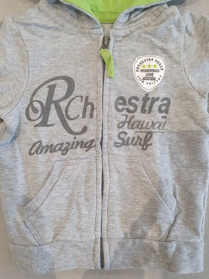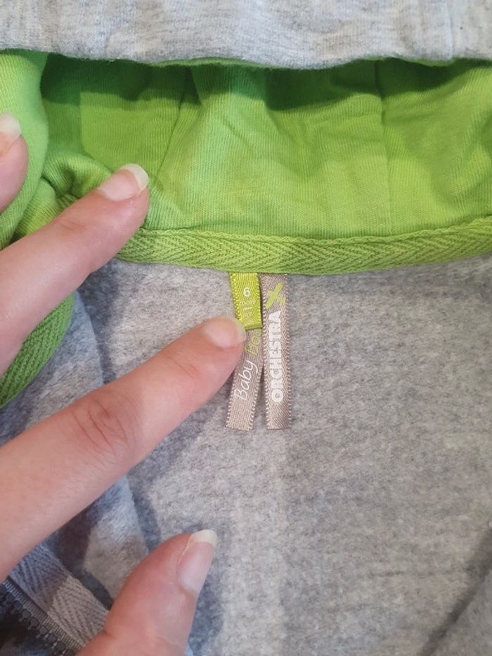 Gilet zippé à capuche, gris et vert, orchestra taille 6 mois. Très bon état