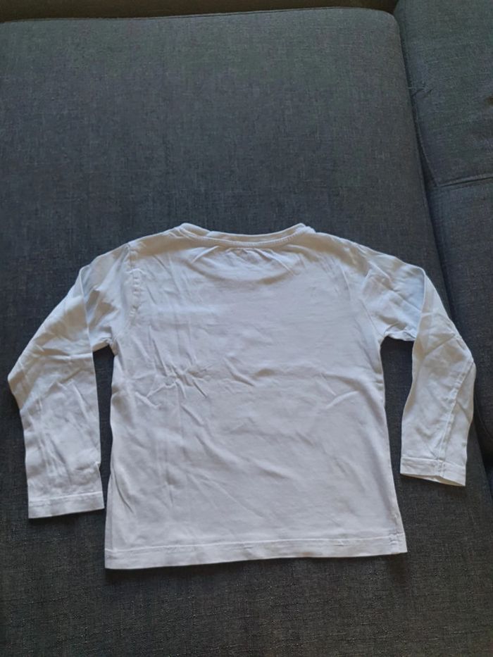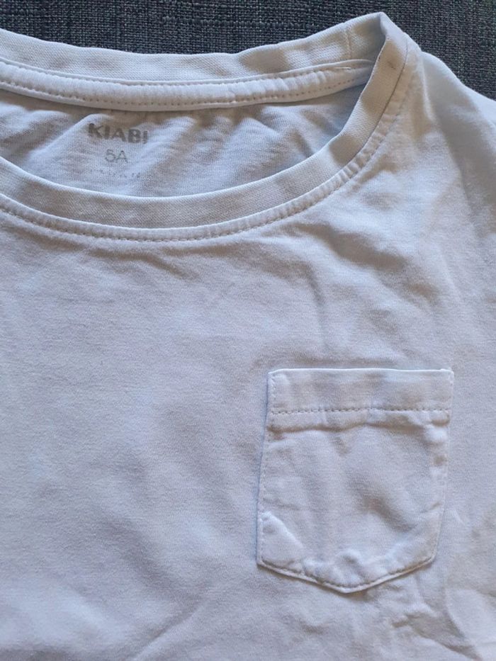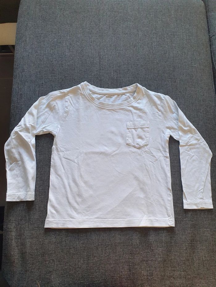 Manches longues avec petite poche. Beau blanc car neuf, je n'ai pas pris le risque de le porter car j'ai peur des taches sur le blanc 😅. Donc neuf, ni troué ni taché. Marque kiabi taille 5 ans (L1)