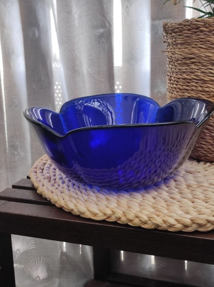 Jolie saladier vintage en verre bleu cobalt en forme de fleur. Dimensions Diamètre 23 Hauteur 6