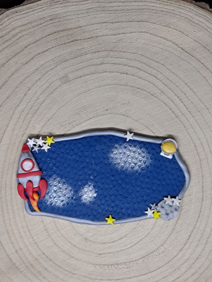 Plaque que porte réalisée en argile polymère sur le thème de l'espace avec une fusée A personnaliser avec le prénom de votre choix. Vous pouvez également choisir la couleur de l'écriture si vous le souhaitez Taille : 14 cm de long, 7.5cm de haut Si vous désirez un autre thème n'hésitez pas à me contacter 😉