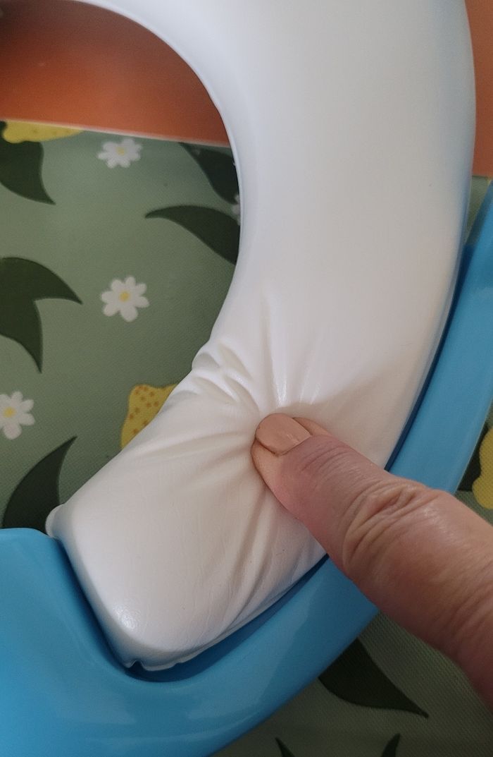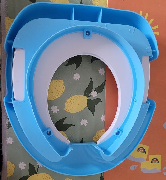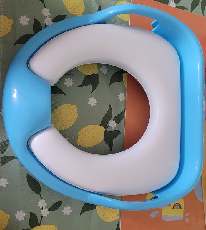 Vends réducteur toilette bébé bleu. Siège souple En excellent état. Dimension : 29 cm de large, sur 31 cm de long. S'adapte à tous les toilettes