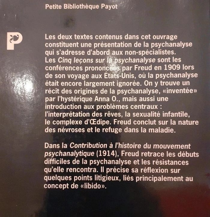 suivi de contribution au mouvement psychanalytique Edition Petite bibliothèque Payot Les Cinq leçons sur la psychanalyse sont les conférences prononcées par Freud en 1909 lors de son voyage aux Etats-Unis, où la psychanalyse était encore largement ignorée. On y trouve un récit des origines de la psychanalyse, .... #freud #psychanalyse