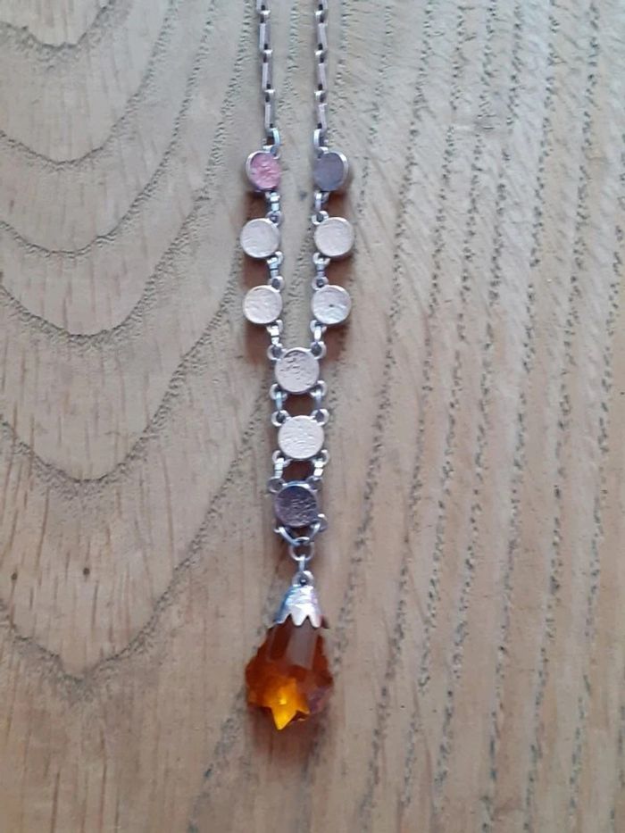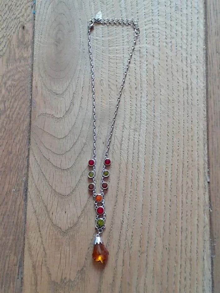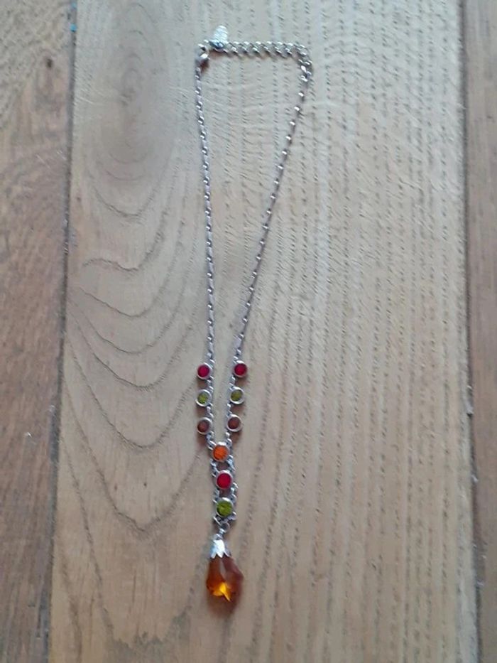 Collier avec des pierres strass de toutes les couleurs. le collier est composé d'une chaine qui dans le Y se transforme en pierres colorées taillées scintillantes. La goutte du pendentif est de couleur orange. #Misspoulette2bijoux #collier #colliercoloré #collierY