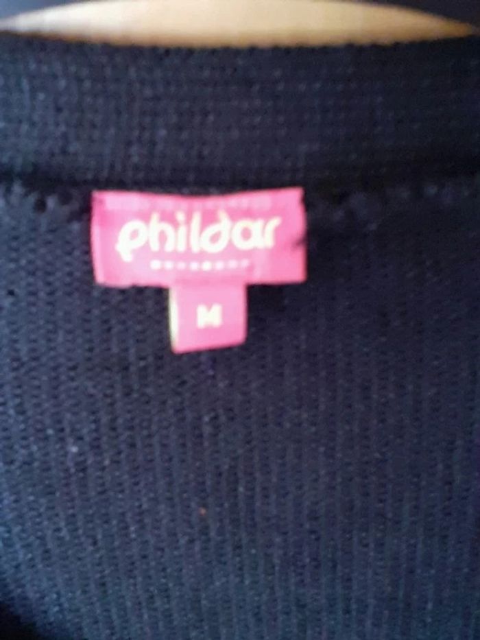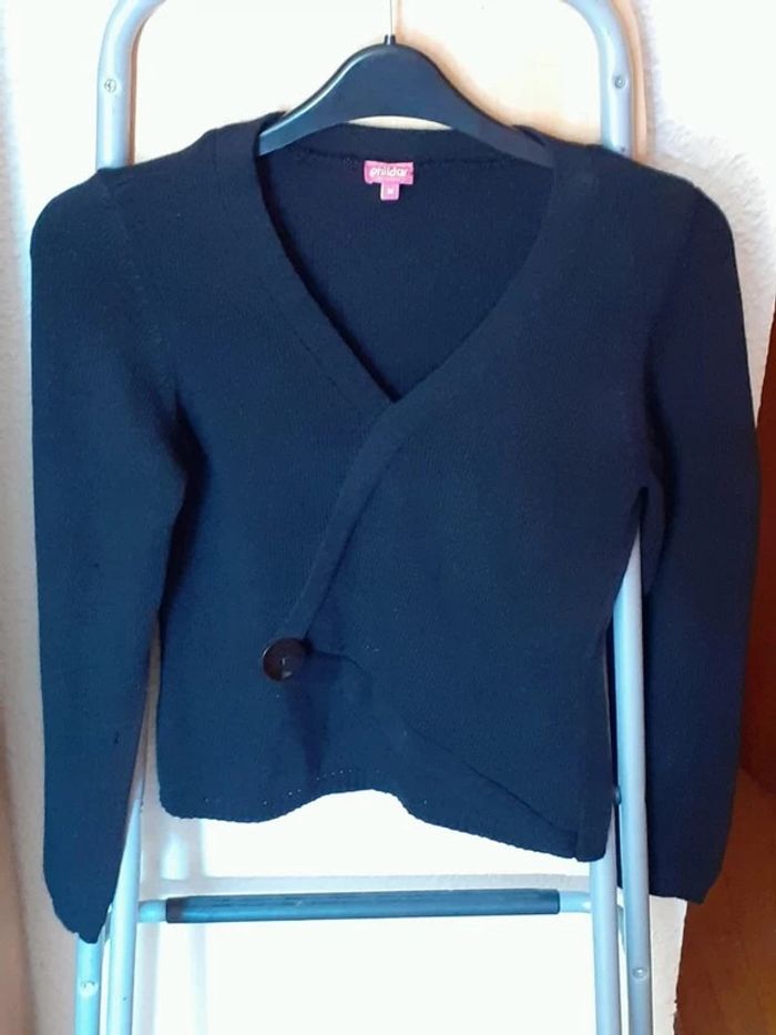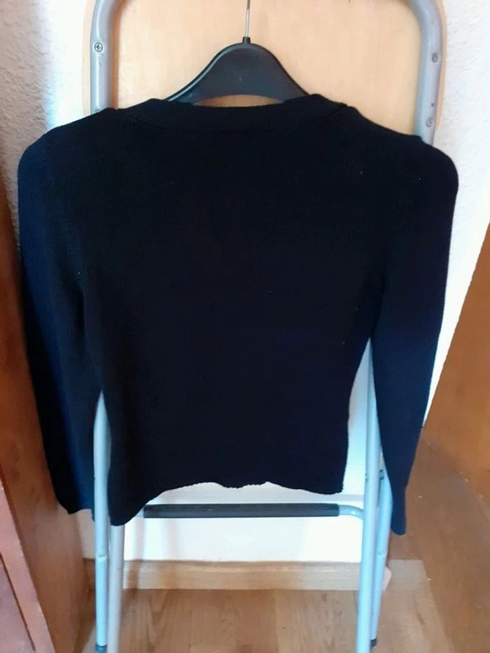 Pull esprit cache coeur noir un gros bouton décoratif marque le croisement en maille souple et légere 65% coton 35% polyamide 2 mailles ont sauté voir photo peu porté #Misspoulette2FM #phildar