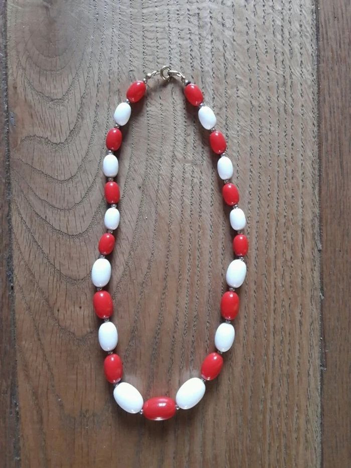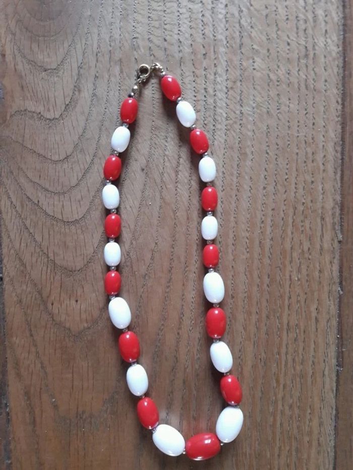 collier fantaisie aux perles blanches et rouges en résine. Collier des années 80 collier rétro #colliervintage #colliereighties #Misspoulette2bijoux #eighties #vintage #années80 #bijourétro