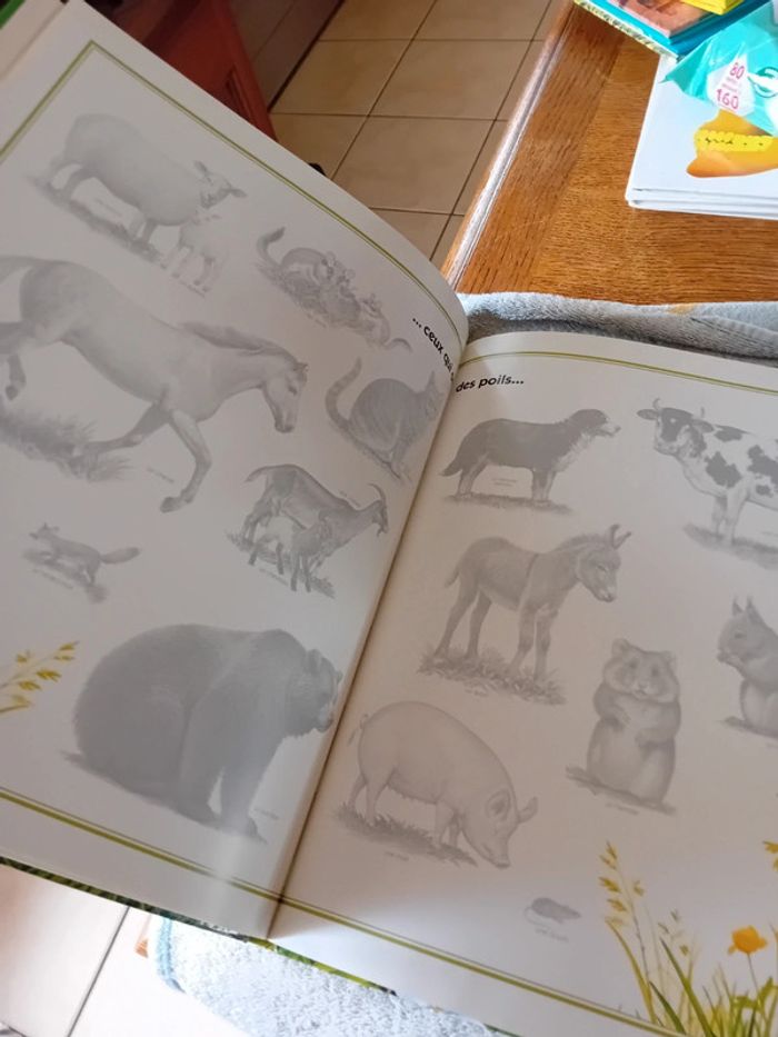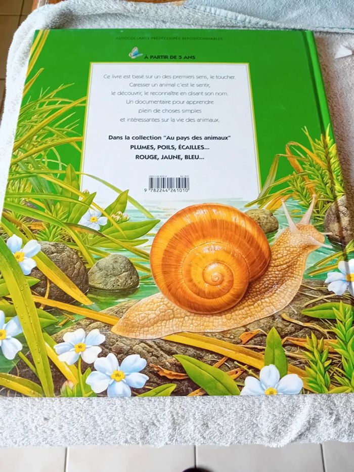 Livre au pays des animaux plumes,poils,écailles 3 ou 4 autocollants déjà placé