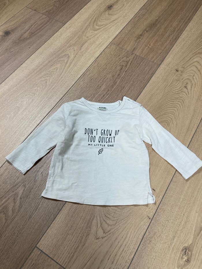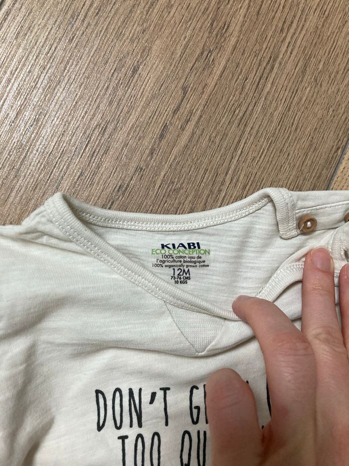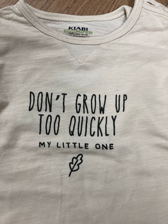 T-shirt manches longues blanc cassé/beige avec message « don’t grow up it’s à trap » Taille : 12 mois Marque : Kiabi Matière : 100% coton Etat : très bon état N’hésitez pas à regarder l’ensemble de mon dressing, je fais des prix pour les lots 🍀