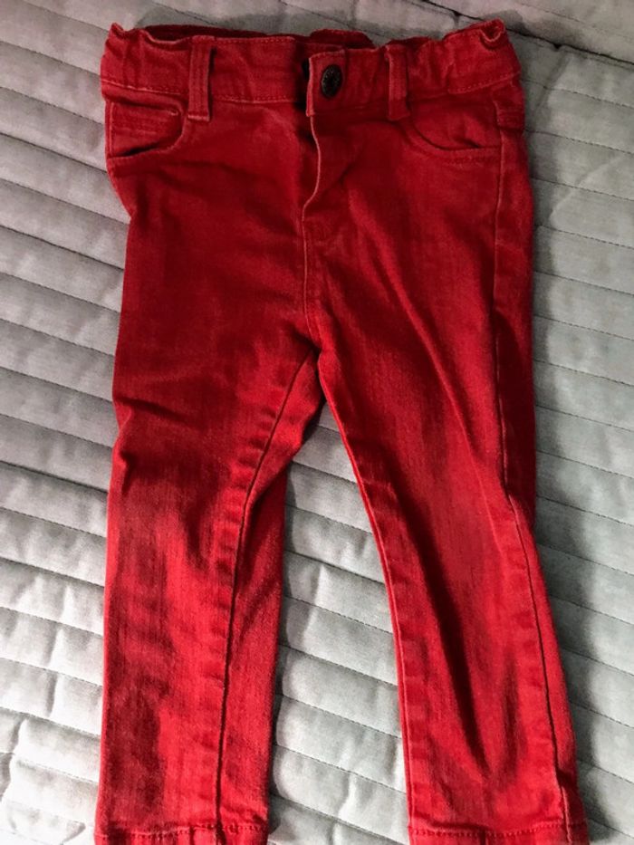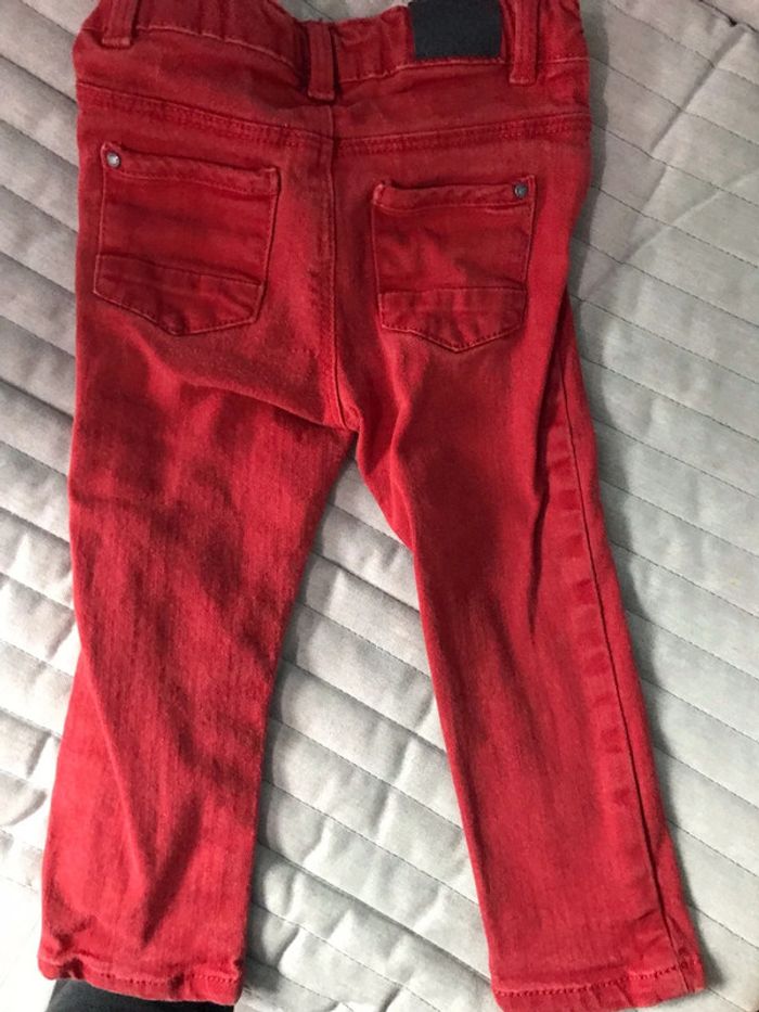 Jean slim rouge . Pas de taches ni trou. La couleur est encore bien rouge, mais le jean « bouloche » un peu