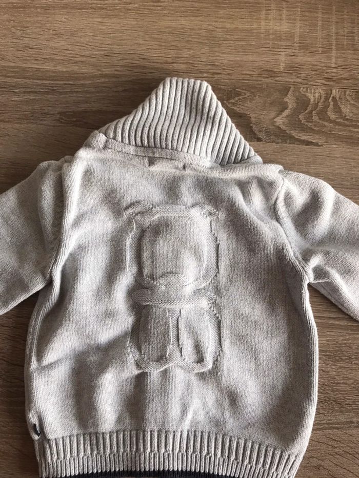 Gilet épais gris en bon état sans trou ni tâches quelques bouloches. 18 mois