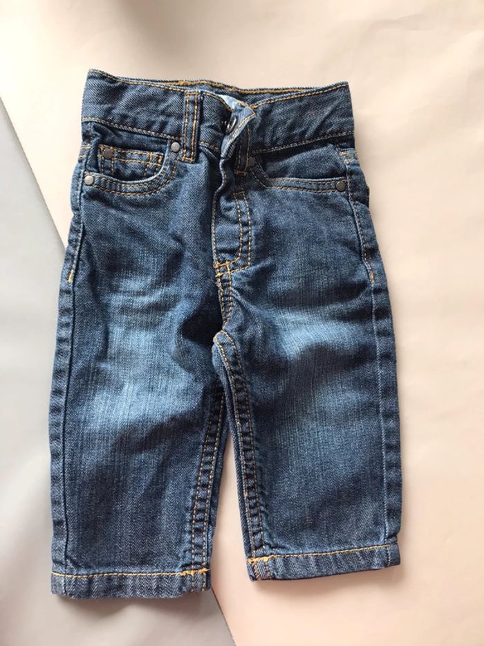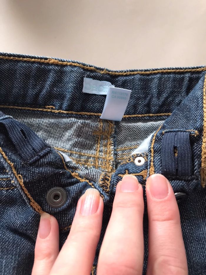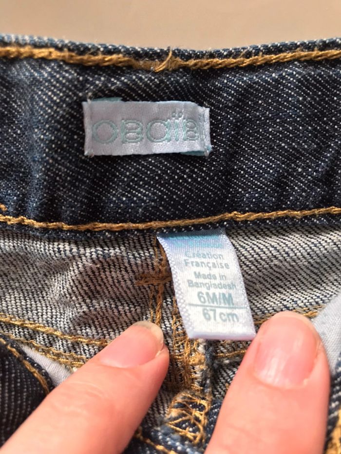 jean obaibi quasiment neuf. porté 1 seule fois. taille réglable noté 6 mois mais taille petit. mes fils ne sont pas gros et ils sont serrés au ventre. Je dirai que c’est plutôt un 3 mois.