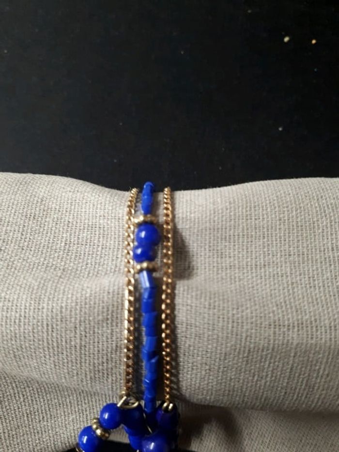 3 Bracelets enfants Matières métal et perles Couleurs doré et bleu Dimension 5cm de diamètre En très bon état