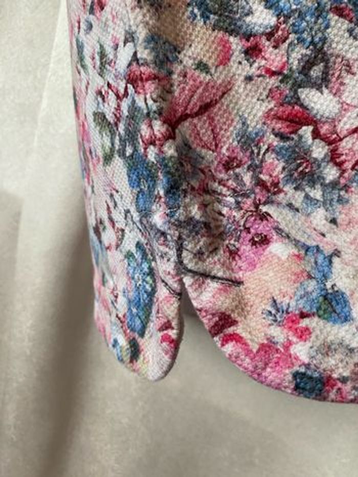 Très jolie robe manches courtes , base arrondie, entièrement doublée Tissu nid d’abeille blanc bas fleuri tons bleu et rose Fermeture zip invisible milieu dos Taille 3-4 ans 104 cm 100% coton Et 97% coton 3% elasthane Zara girls