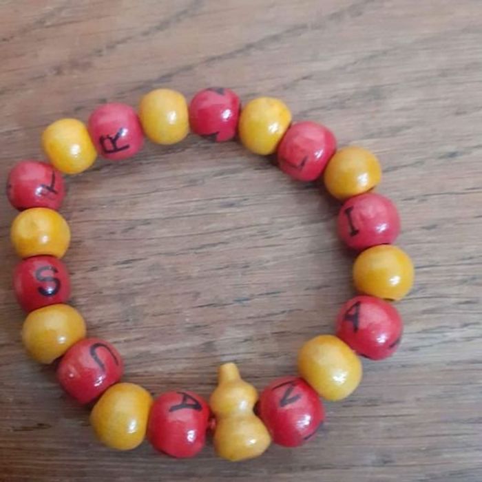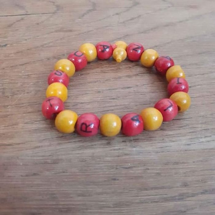 Bracelet élastique mixte Forme boules Marqué australian Couleurs rouge, noir et jaune Matière bois En très bon état Dimensions approximative 8cm de diamètre : 1cm large
