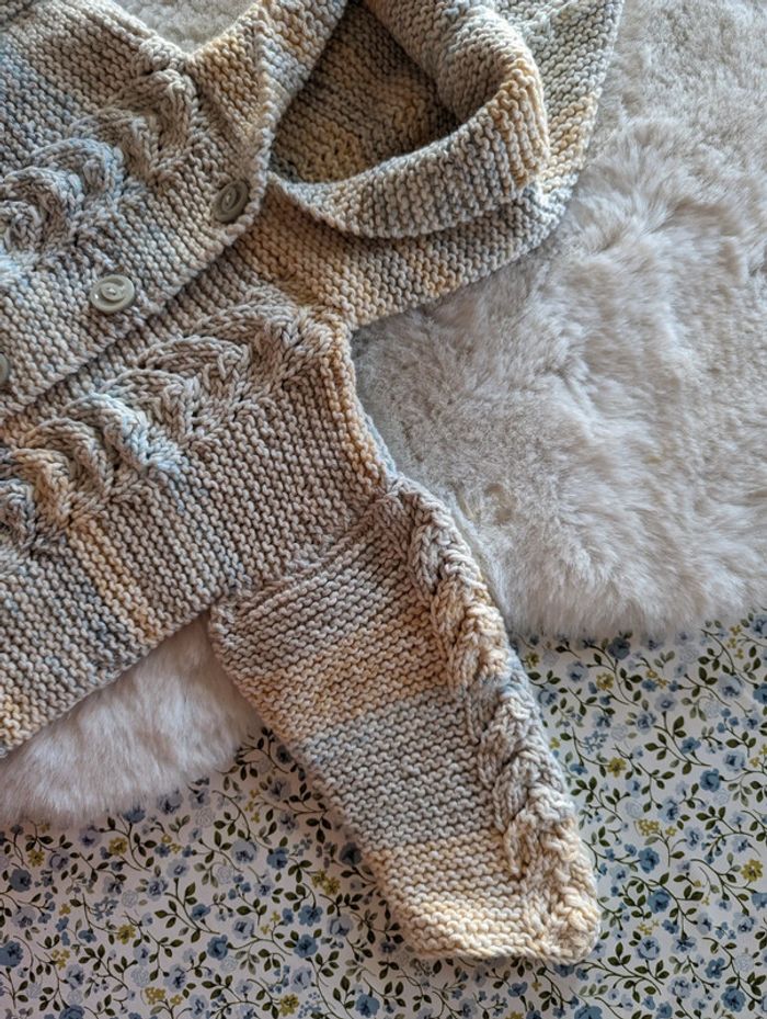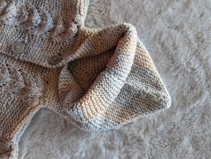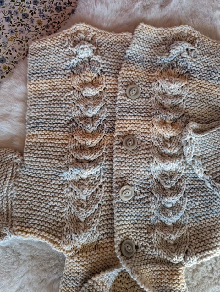 Modèle unique tricoté à la main dans une laine tricolore bleu/beige/jaune. Correspond à du 3 mois. #chadvrchy3mois