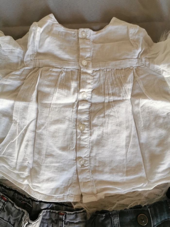 Une blouse blanche (un peu grisée) hyper douce et fine Deux jeans : un Orchestra et un Kiabi Taille 6 mois #chadvrchy6mois