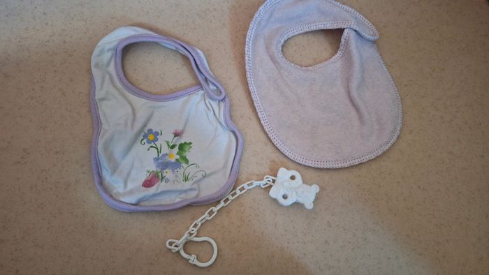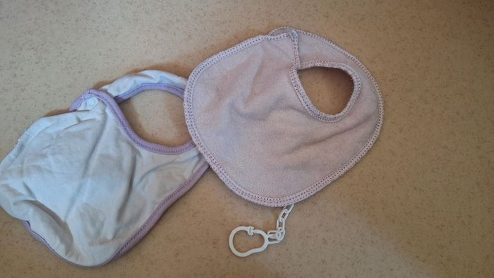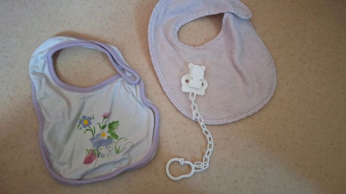 2 petit bavoir en très bon état offert attache tétine blanc #zaceci28naissance Rose clair et fleur violet #zaceci28puericulture