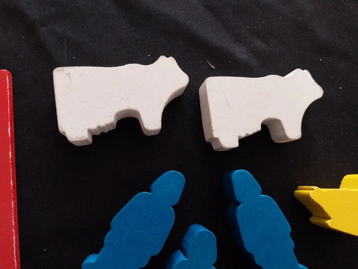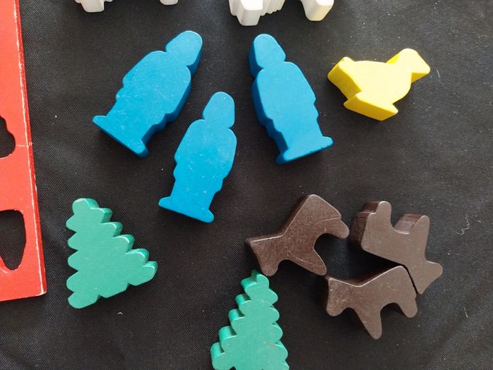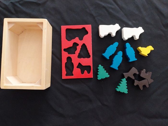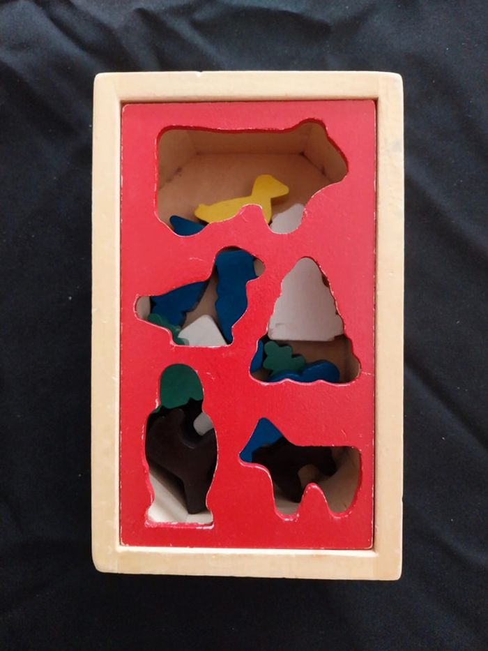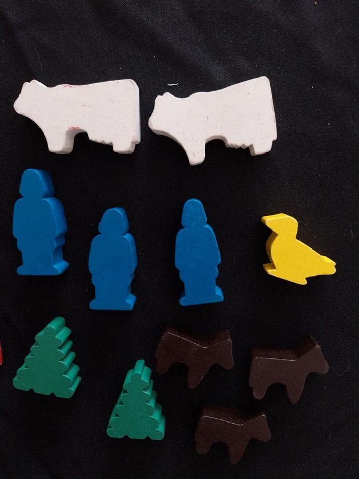 Petite bois de jeu d'encastement vintage en bois Des traces d'usure principalement sur la plaque rouge et les vaches voir photos