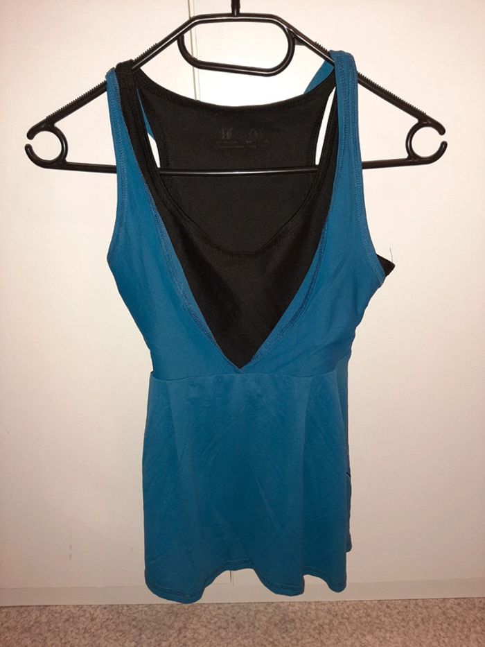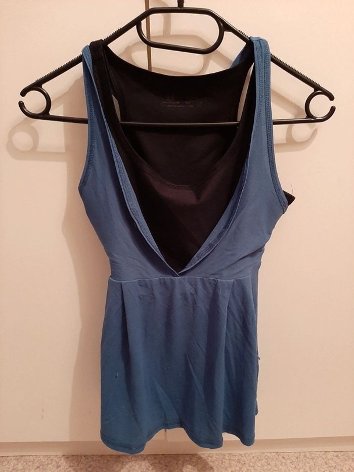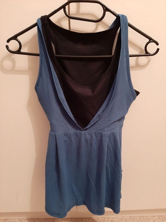 Joli débardeur de sport, maintien bien la poitrine, pouvant être utilisé également dans un autre contexte... noir et bleu, taille S, très bon état. N'hésitez pas à aller faire un tour dans mon dressing 🙂prix dégressif sur les lots, que des petits prix 🌸