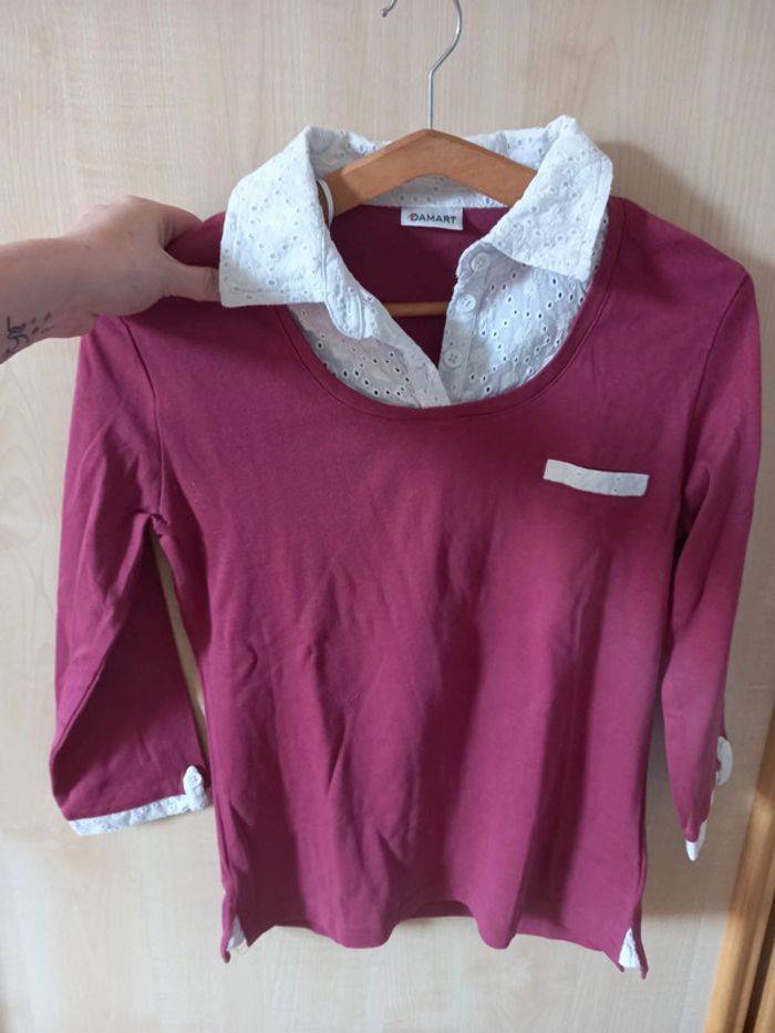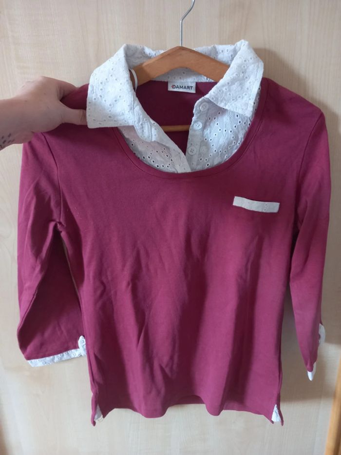 Haut manches 3/4 avec col de chemise blanc intégré. Très bon état. Couleur prune, lila