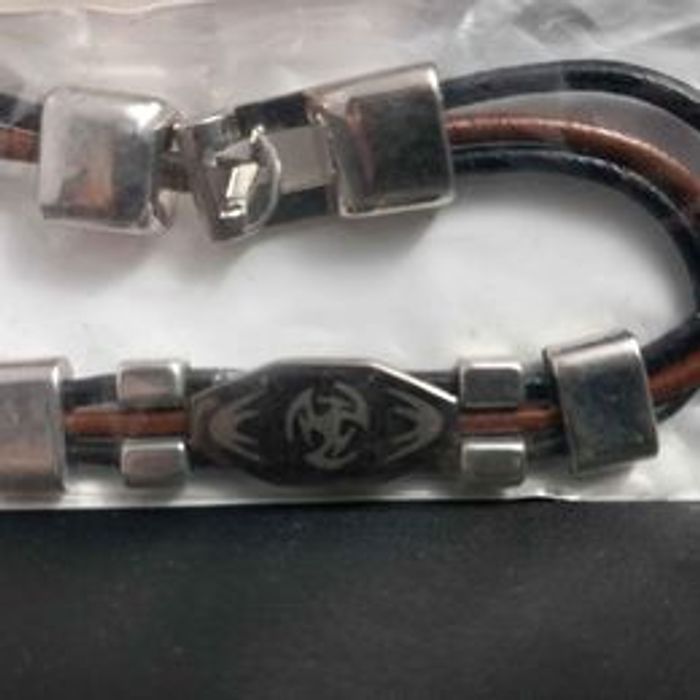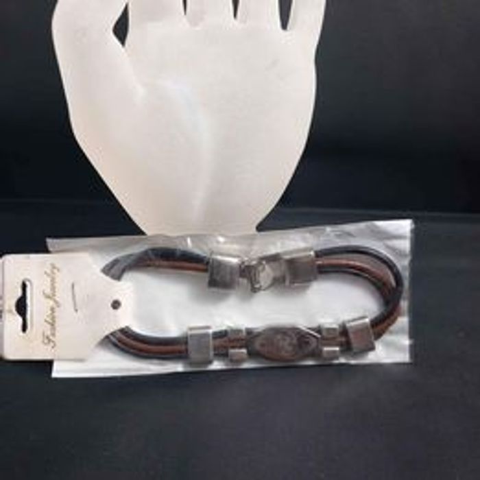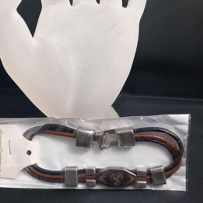 Bracelet homme Motifs shuriken Couleurs argenté, marron et noir Matières métal et cuir Marque fashion jewelry Dimension approximative 1cm de large En très bon état