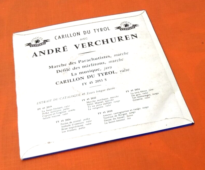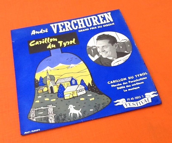 Vinyle 45 tours André Verchuren Carillon du Tyrol (1958) Festival FY 452053 S A1 Marche Des Parachutistes (Marche) Written-By – M. Thiriet* A2 Défilé Des Mirlitons (Marche) Written-By – André Verchuren, D. Soleil* B1 La Musique (Java) Written-By – André Verchuren, R. Denoncin* B2 Le Carillon Du Tyrol (Valse) Written-By – André Verchuren, D. Soleil*