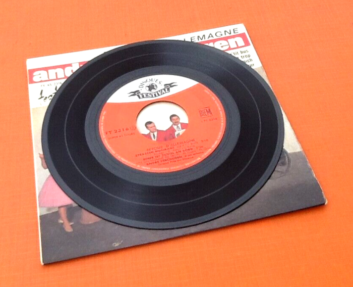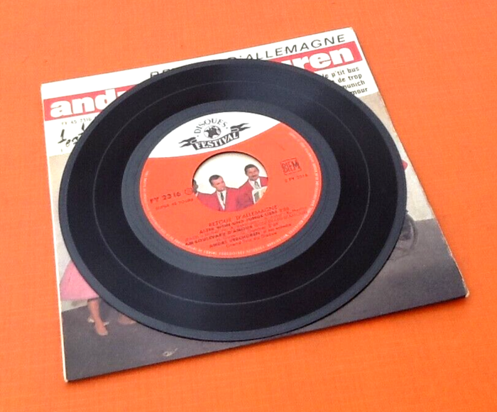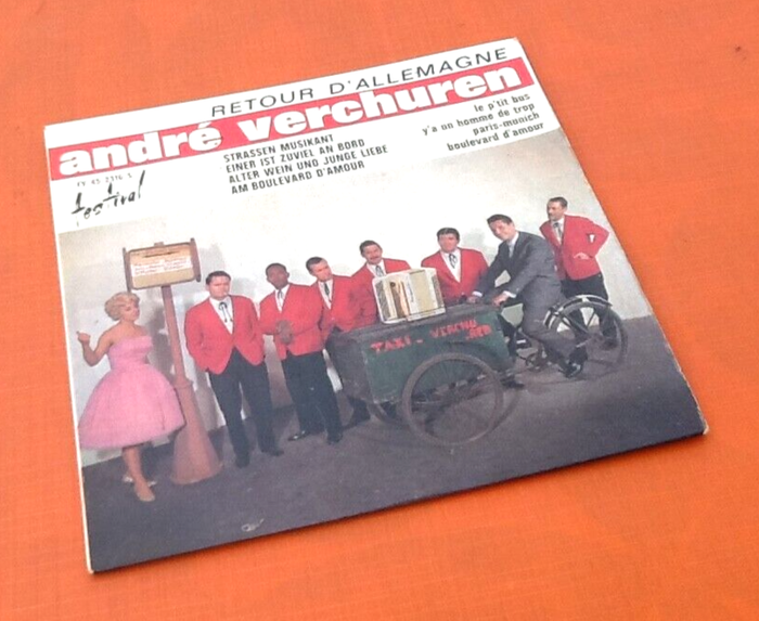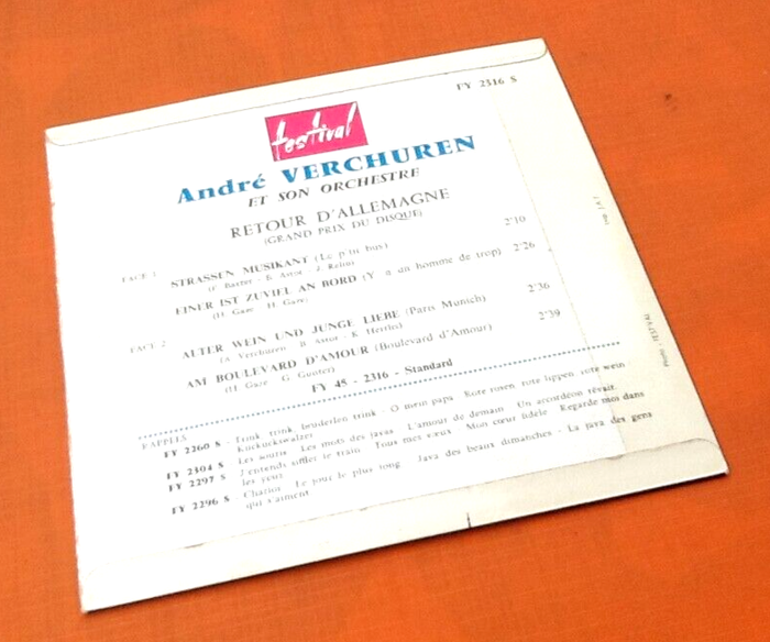 Vinyle 45 tours André Verchuren Retour d' Allemagne (1963) Festival FY 452316 S A1 Strassen Musikant (Le P'Tit Bus) 2:10 A2 Einer Ist Zuviel An Bord (Y' A Un Homme De Trop) 2:26 B1 Alter Wein Und Junge Liebe (Paris Munich) 2:36 B2 Am Boulevard D'Amour (Boulevard D'Amour) 2:39