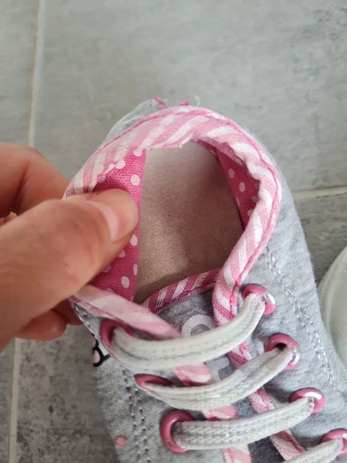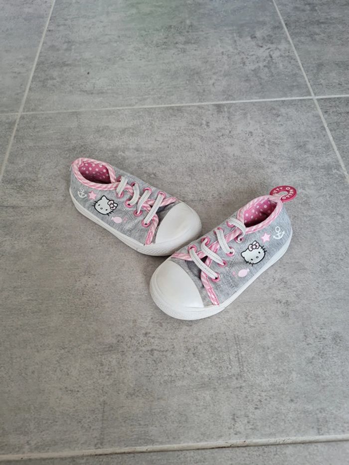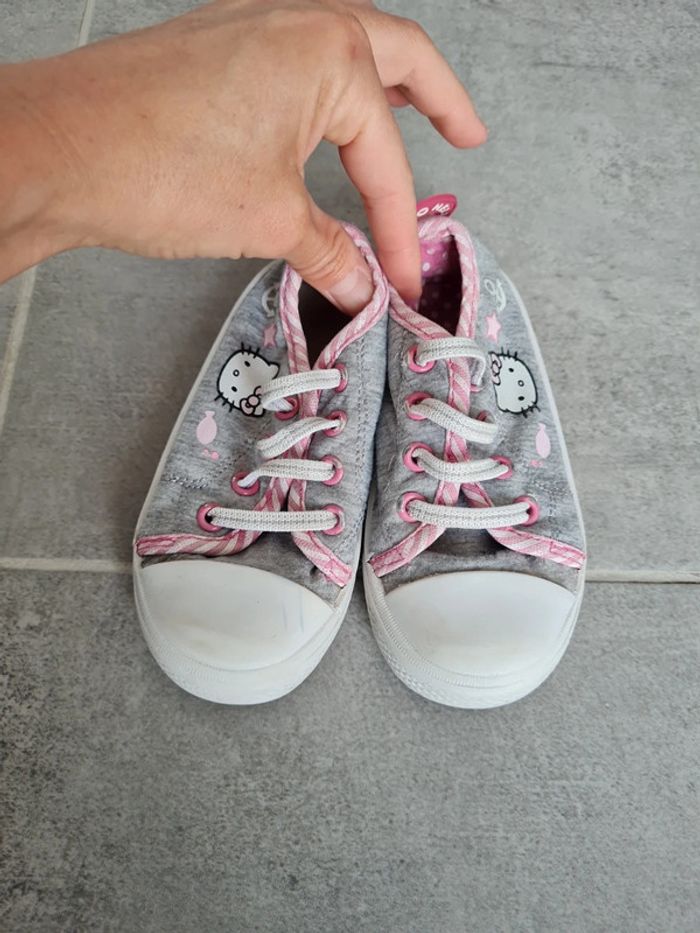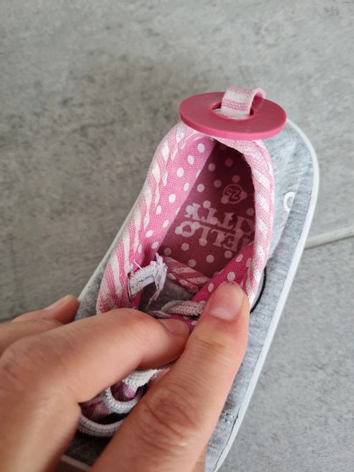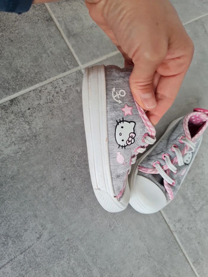Baskets basse en tissu Hello Kitty taille 25. Lacets élastiques. Revêtement tissu enlevé d'un côté et tirette talon également, mais pas choquant. Ont été portées mais peuvent encore servir. Ont été passées en machine. Maison non fumeur