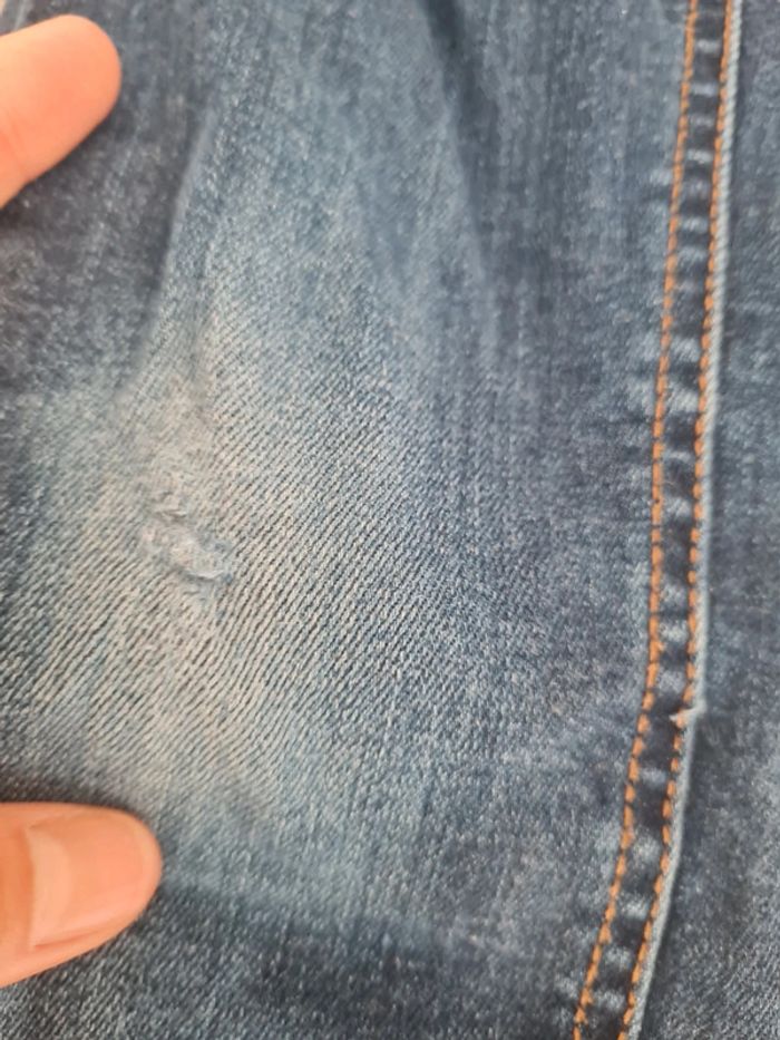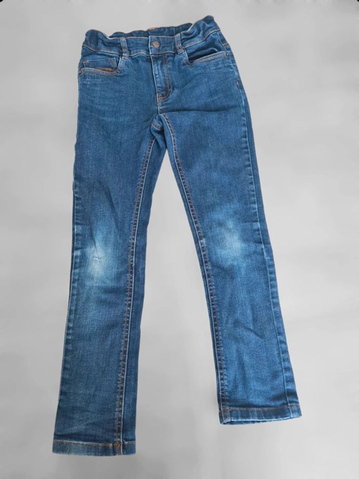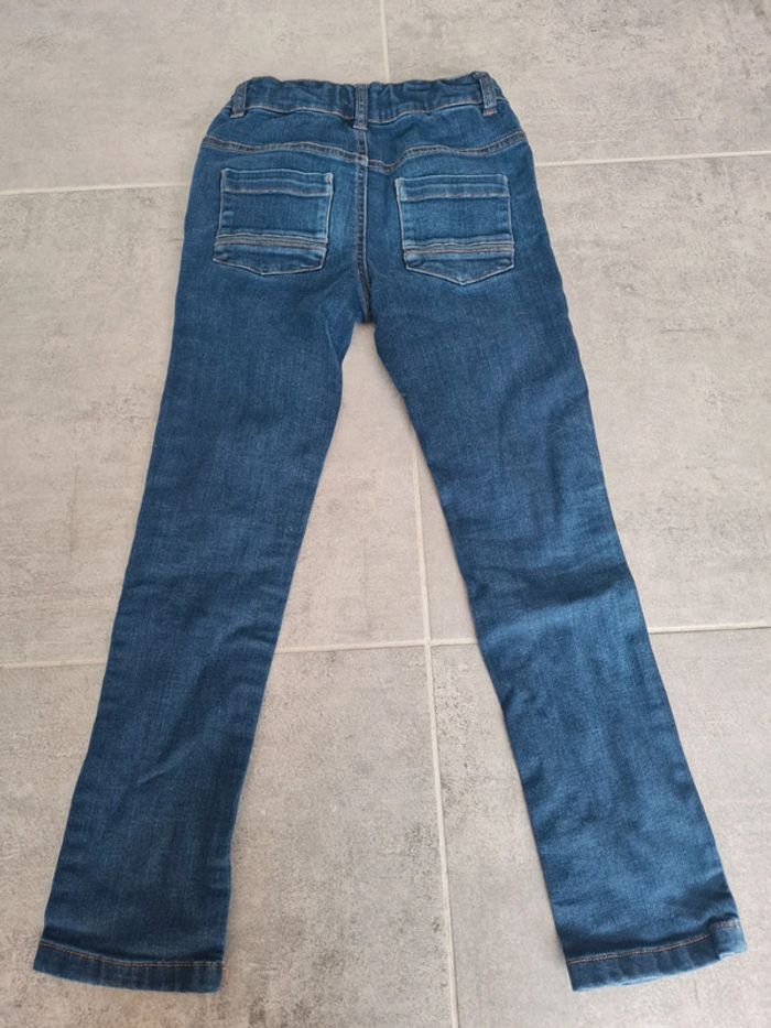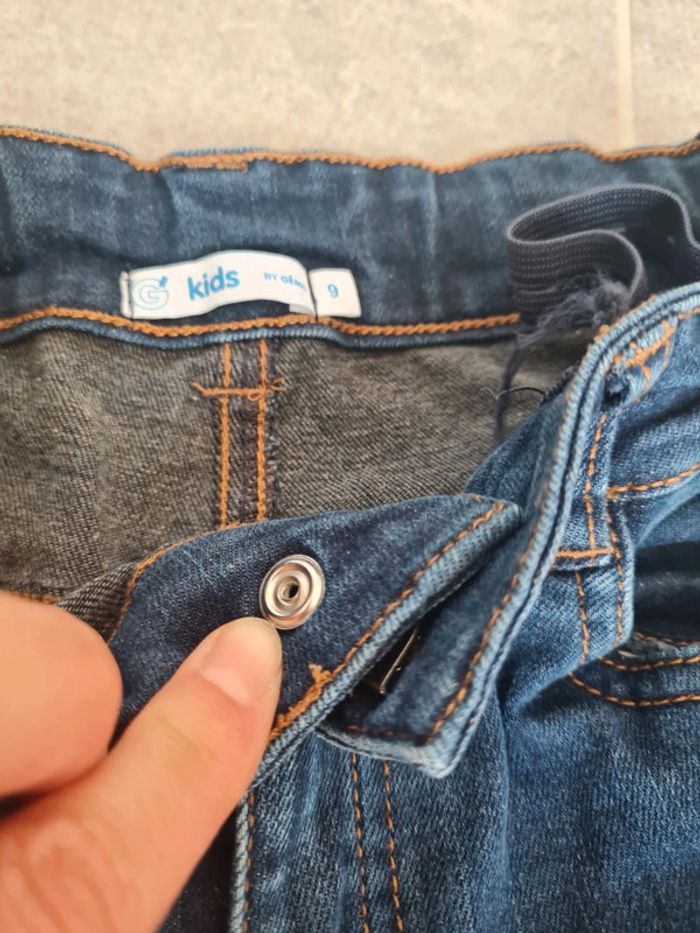 Jeans garçon Gemo taille 9 ans. Bleu foncé, couleur un peu usée aux genoux-> tissu un peu eraflé d'un côté mais pas de trou. Pas de tâche. Articles lavés avant la vente, maison non fumeur