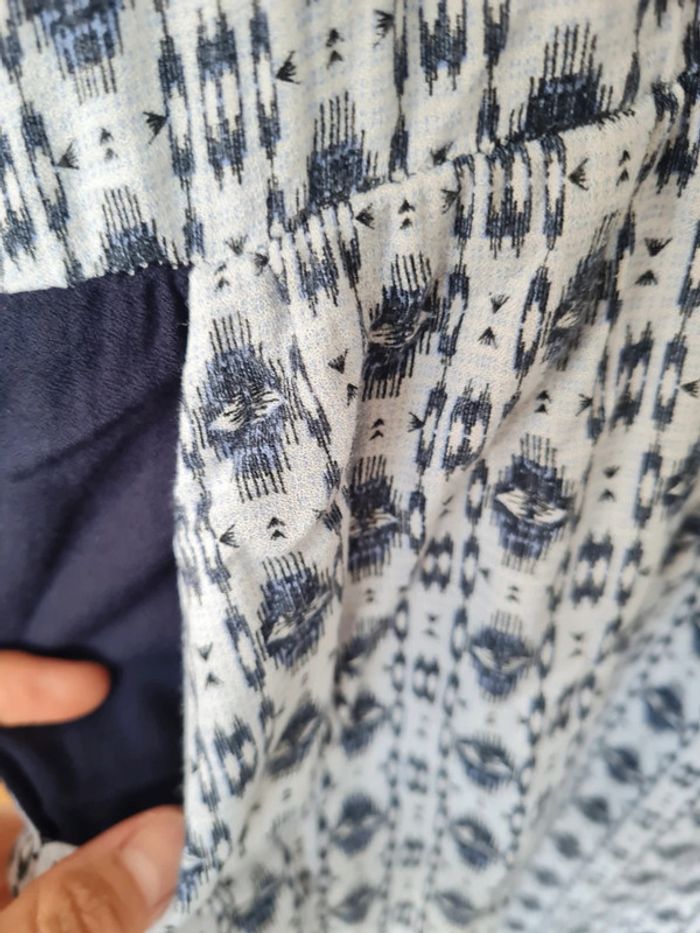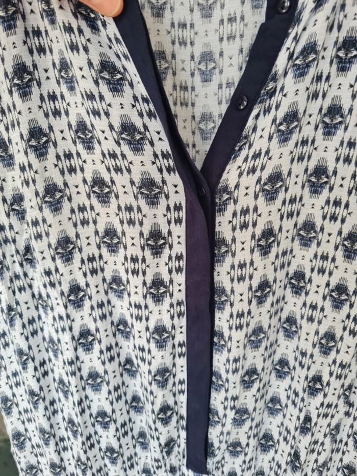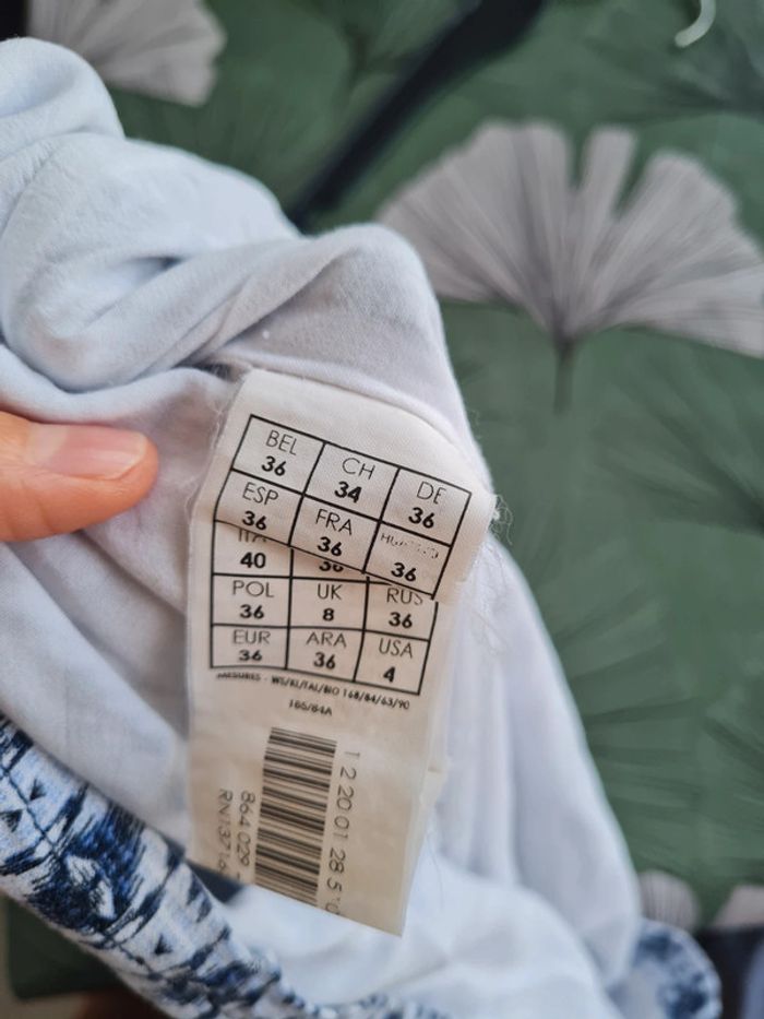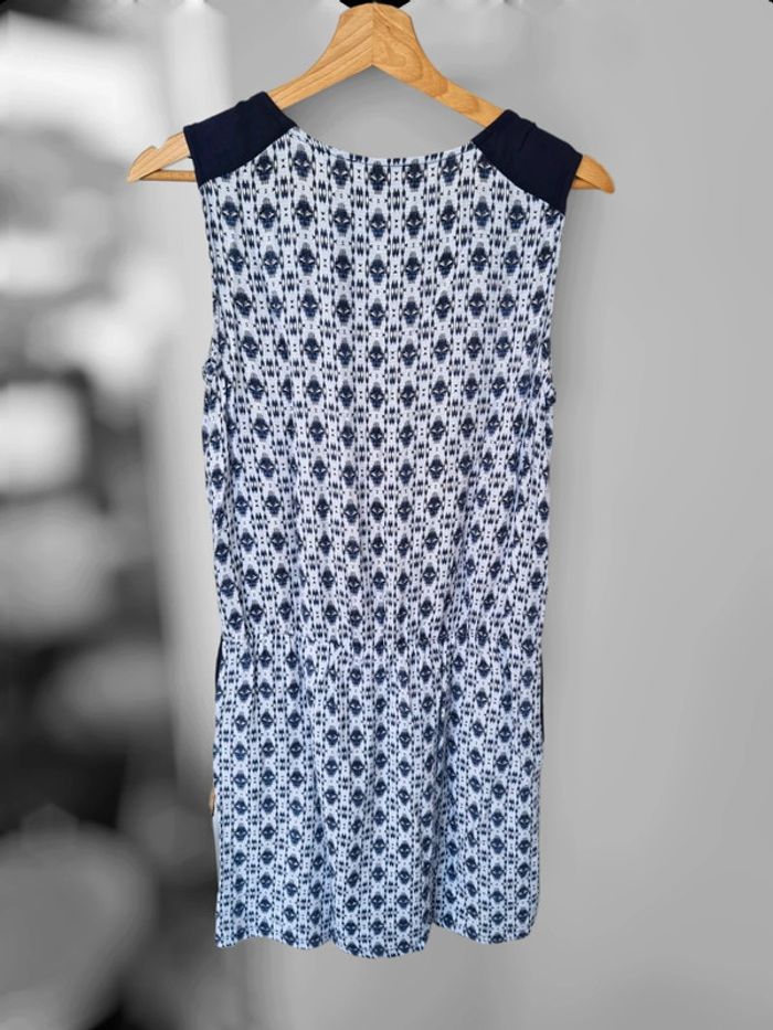 Robe droite sans manche, idéal robe de plage, Promod taille 36. Tissu blanc à motifs bleu marine, boutonnée sur le devant, 2 poches. Très bon état. Articles lavés avant la vente. Maison non fumeur.