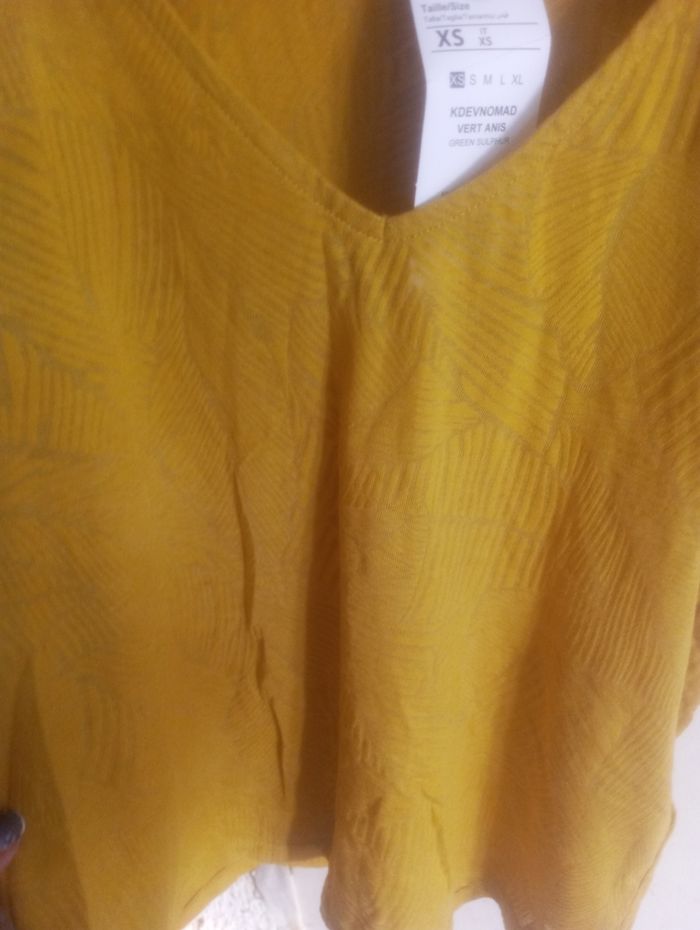 Tee shirt transparent avec motif feuille couleur moutarde taille XS Coton et polyester très agréable en maille legere