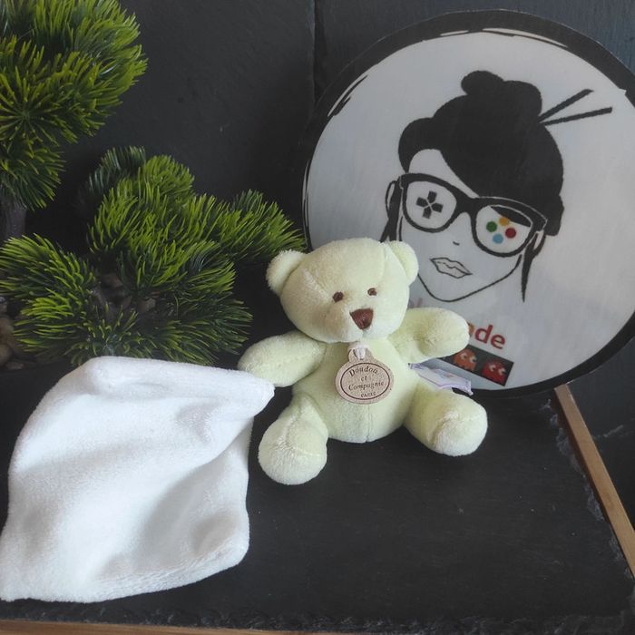 doudou et compagnie ours jaune vert anis blanc mouchoir mon doudou à moi Bon etat Afin de ne pas abîmer les doudous et de laisser le choix dans l'utilisation de la lessive les peluches ne sont pas lavées avant envoi Description complément : #geektradedoudouetcompagnie Petit nettoyage à prévoir Vous achetez ce que vous voyez les photos font entièrement partie de la description Transport : Les frais de transport comprennent les frais du transporteur ainsi que l'emballage pour protéger au mieux votre achat. Chaque achat est envoyé en format colis avec numéro de suivi Le poids du colis est de 500g finit (je ne peux pas faire moins) il peut donc y avoir plusieurs objets dans le carton si vous le souhaitez (contactez moi afinde grouper les frais de port) Référencement : #geektradedoudou #peluche #plush  #doudou #enfant #bebe