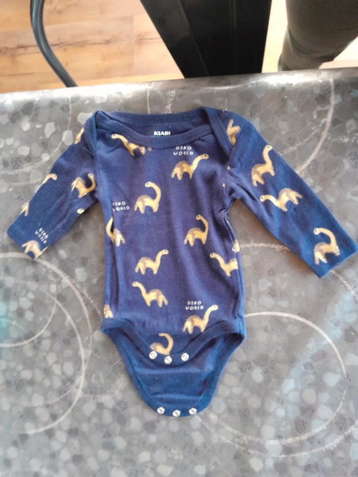 #bebeamandine2386 #3moisamandine2386 lot de 3 bodies manches longues thème Dino 1rouille 1 rayé bleu marine 1 bleu marine coton bio kiabi 3 mois très bon etat