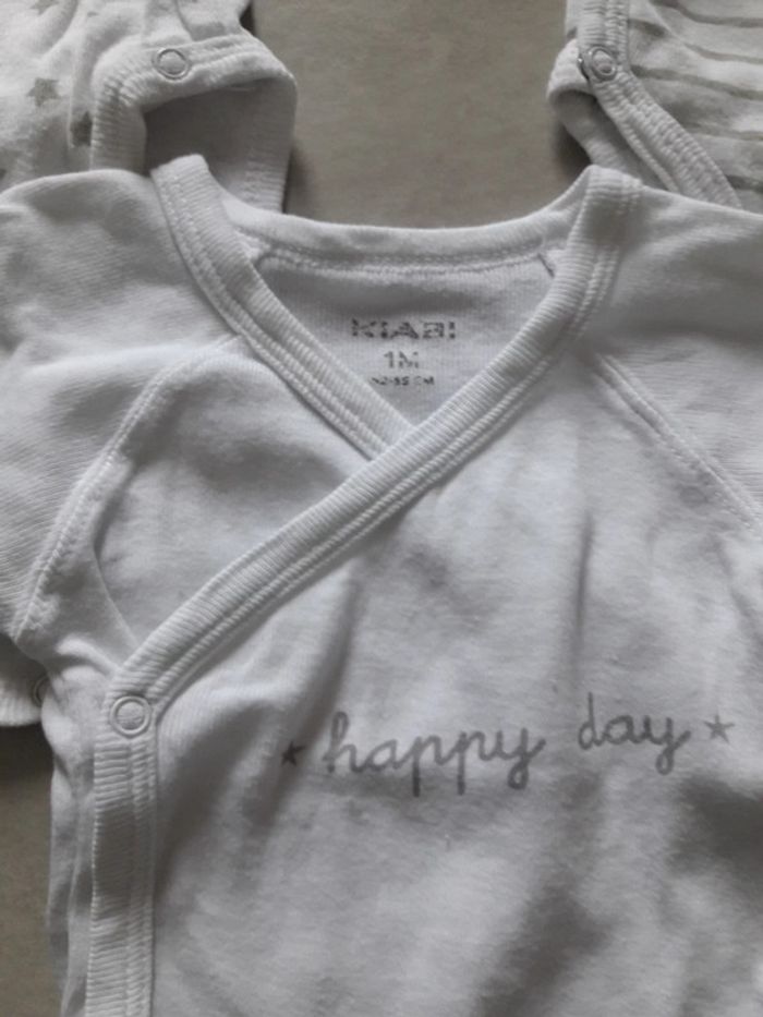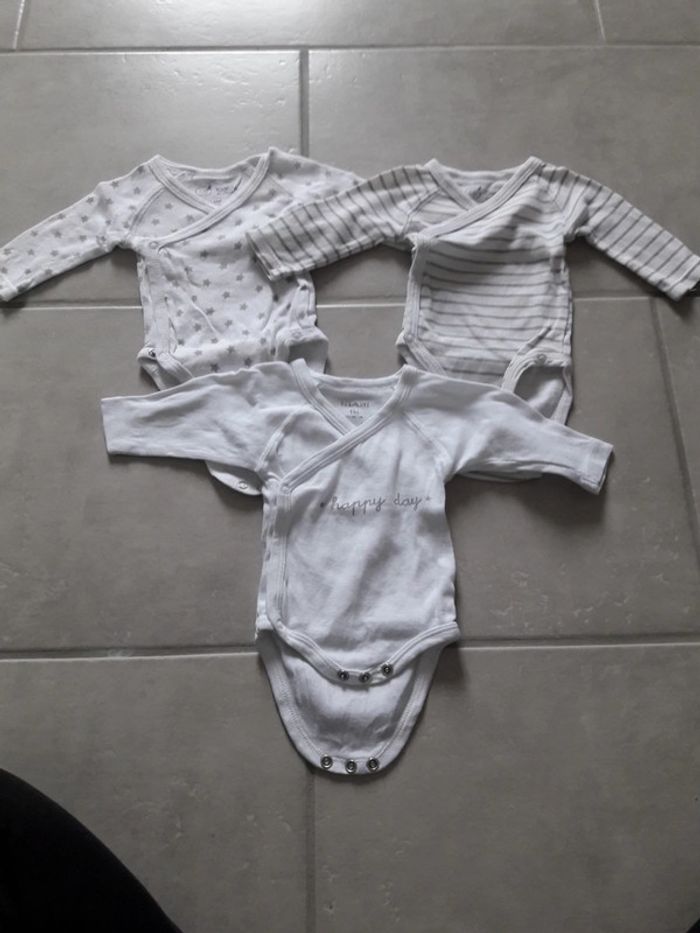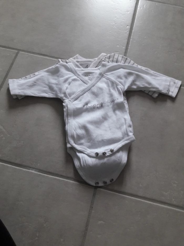 #bebeamandine2386 #1moisgarçonamandine2386 #1moisfilleamandine2386 lot de 3 bodies manches longues 1 mois 1blanc etoile grise 1blanc rayé gris 1blanc happy day kiabi bon état forme brassiere Gémo et Kiabi