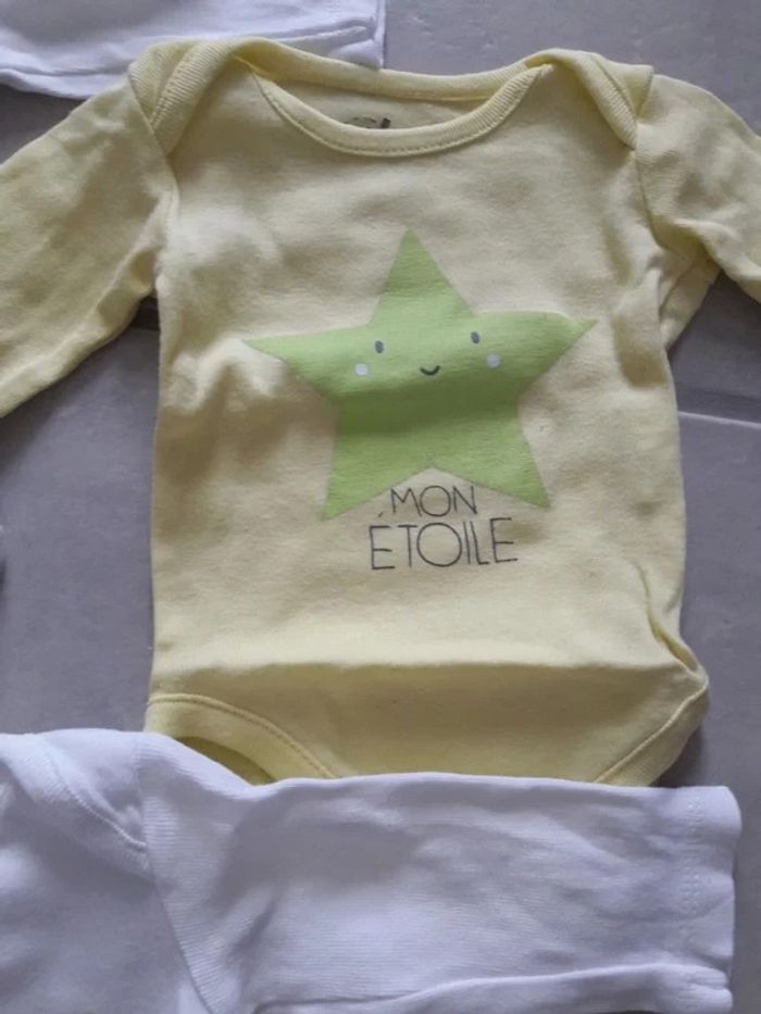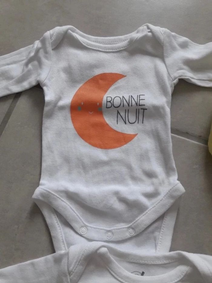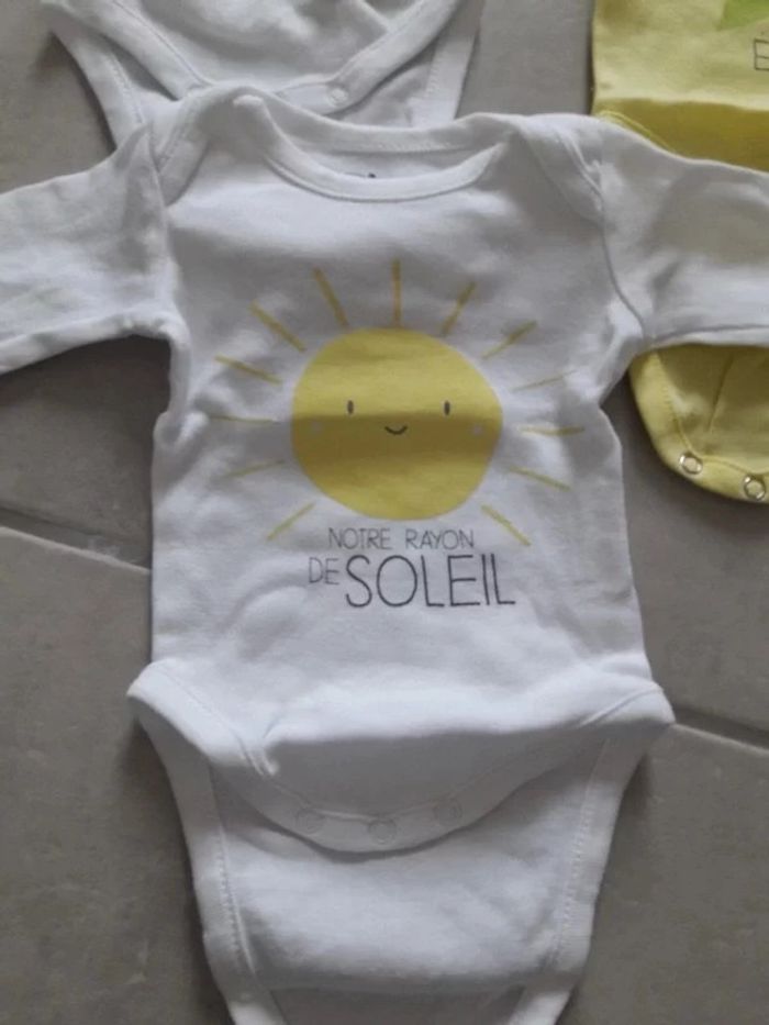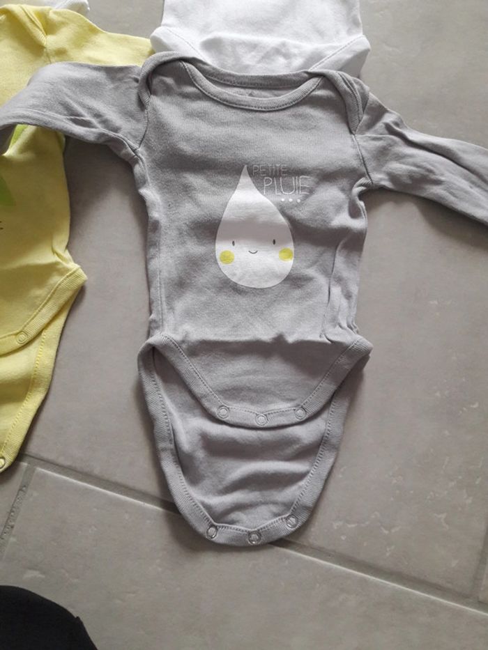 #bebeamandine2386 #1moisgarçonamandine2386 #1moisfilleamandine2386 lot de 4bodies manches longues 2blanc 1jaune 1gris thème météo ciel très bon état 1 mois Gémo