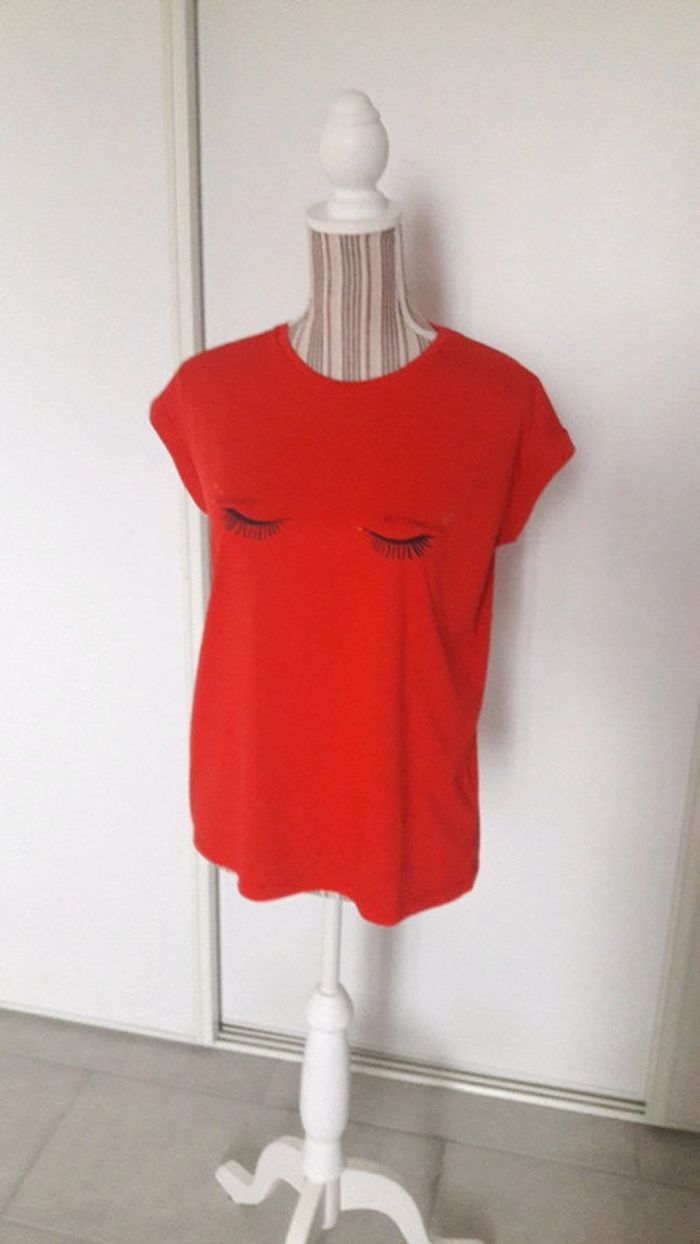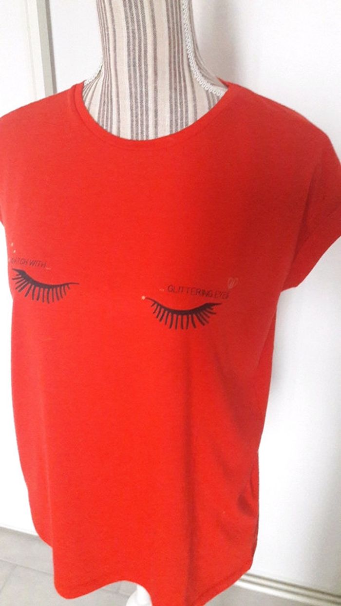 Tee shirt rouge motif cils Gémo S très bon état - photo numéro 2