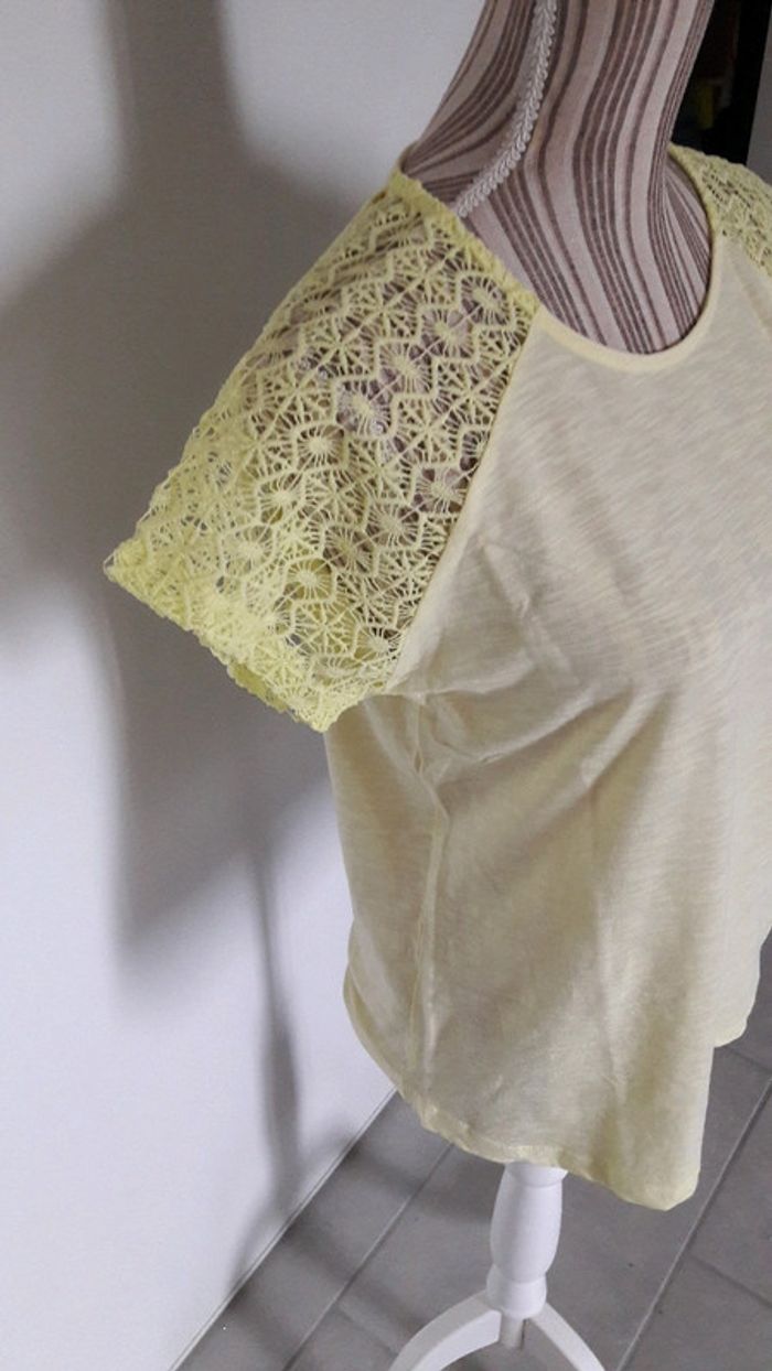 #lfemmeamandine2386 #40femmeamandine2386 Tee shirt jaune uni fantaisi dentelle sur mes 2 epaules/manches Neuf sans etiquette 100%coton et dentelle Gémo Taille L